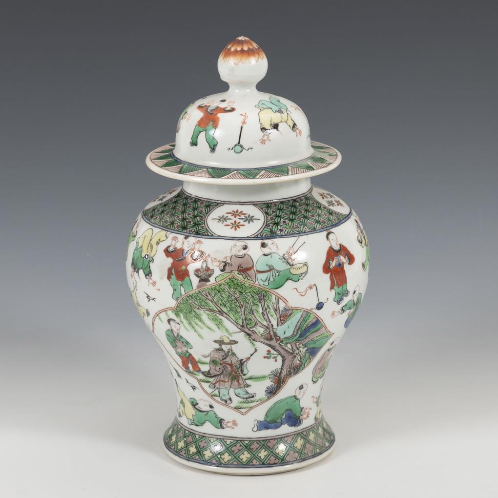 Playing children doing various activities, as well as two cartouches in which children accompany various saints. Lid with the same motifs.