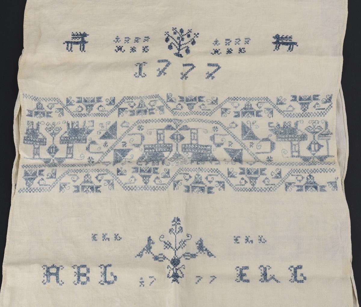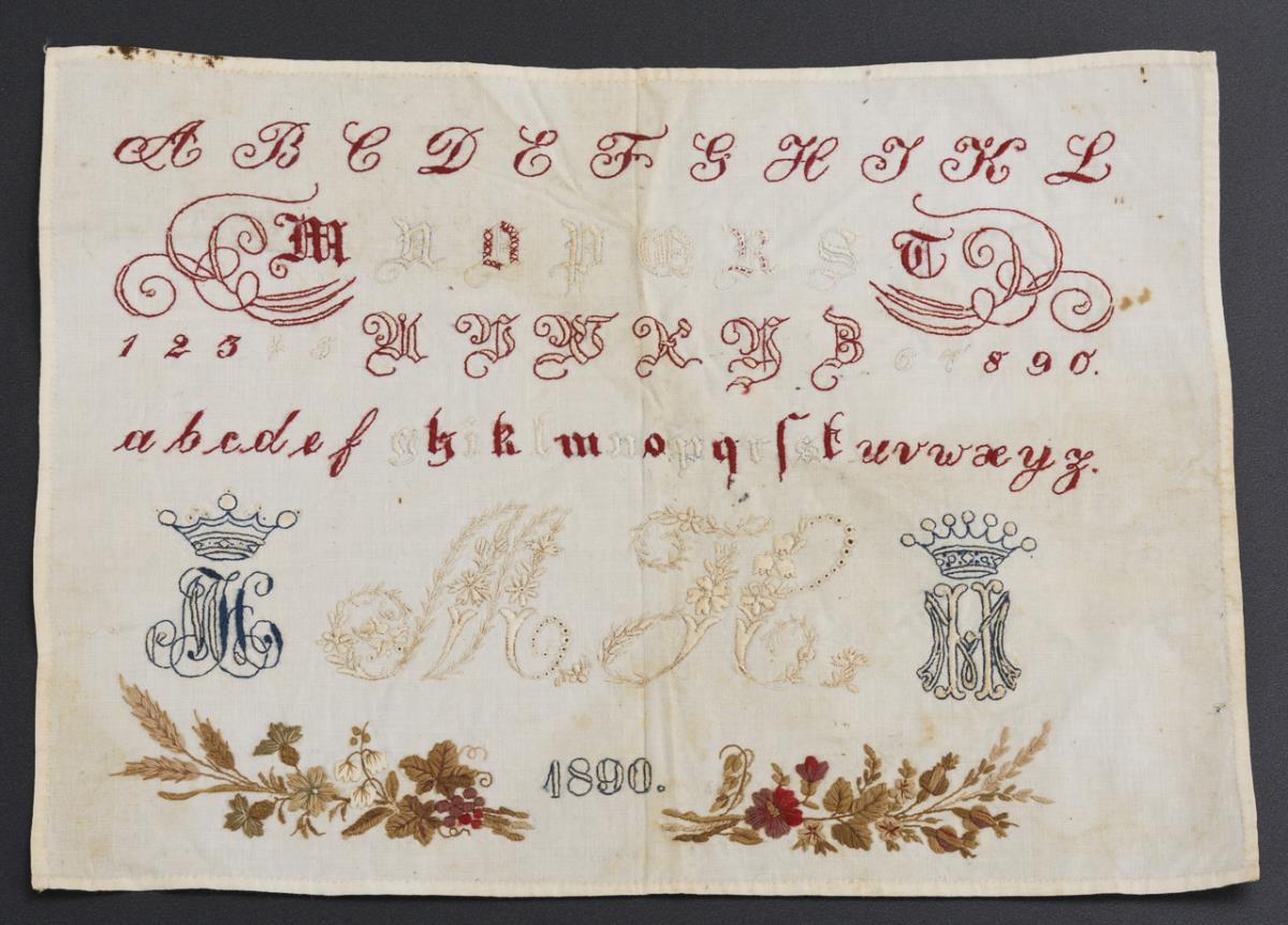 Baroque linen curtain with blue cross-stitch motifs, monograms and date "1777" and crocheted border. / samplers with the alphabet in Antiqua and Fraktur and numbers. Large Biedermeier sampler "C. E. Kreusch" with first names/monograms under symbols. Small sampler with multicolored embroidery, including monograms "MH" and date "1890". Each stained / yellowed, small sampler barely.