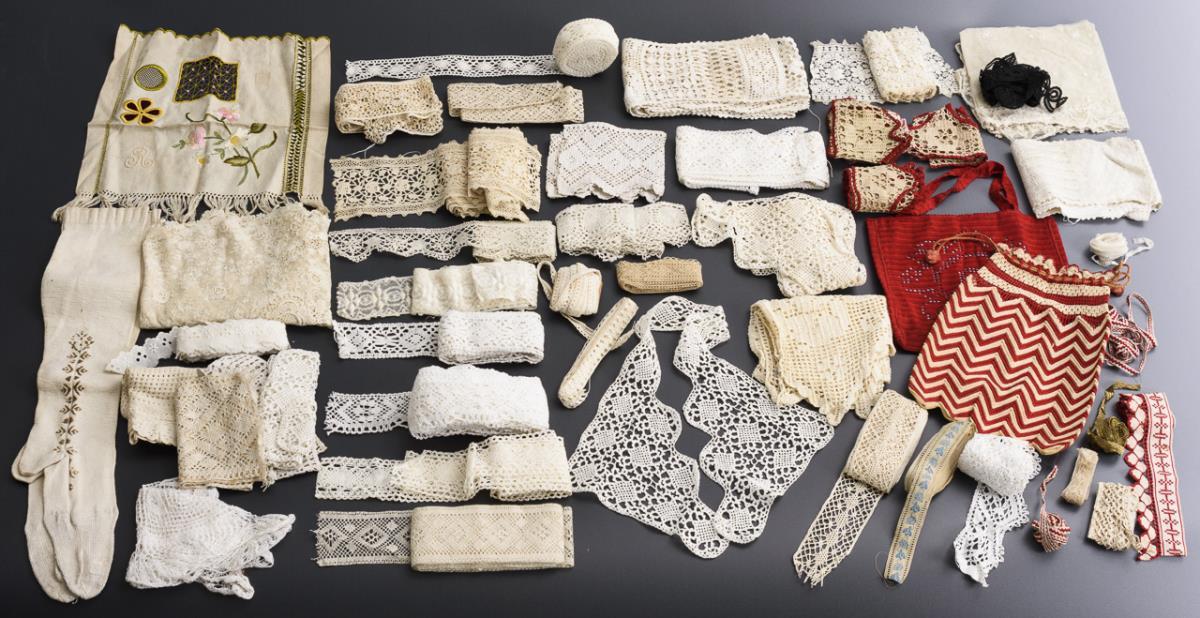 Sample cloth with various embroidery techniques, 1 pair of knitted and embroidered socks, 2 crocheted bags, numerous borders partly tulle, bobbin lace, crochet, embroidered, partly machine.