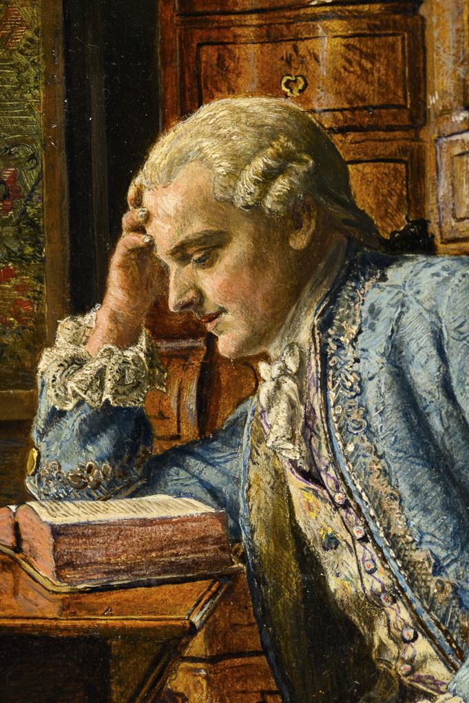 Young man in 18th century dress reading a book at the table in front of the secretary.