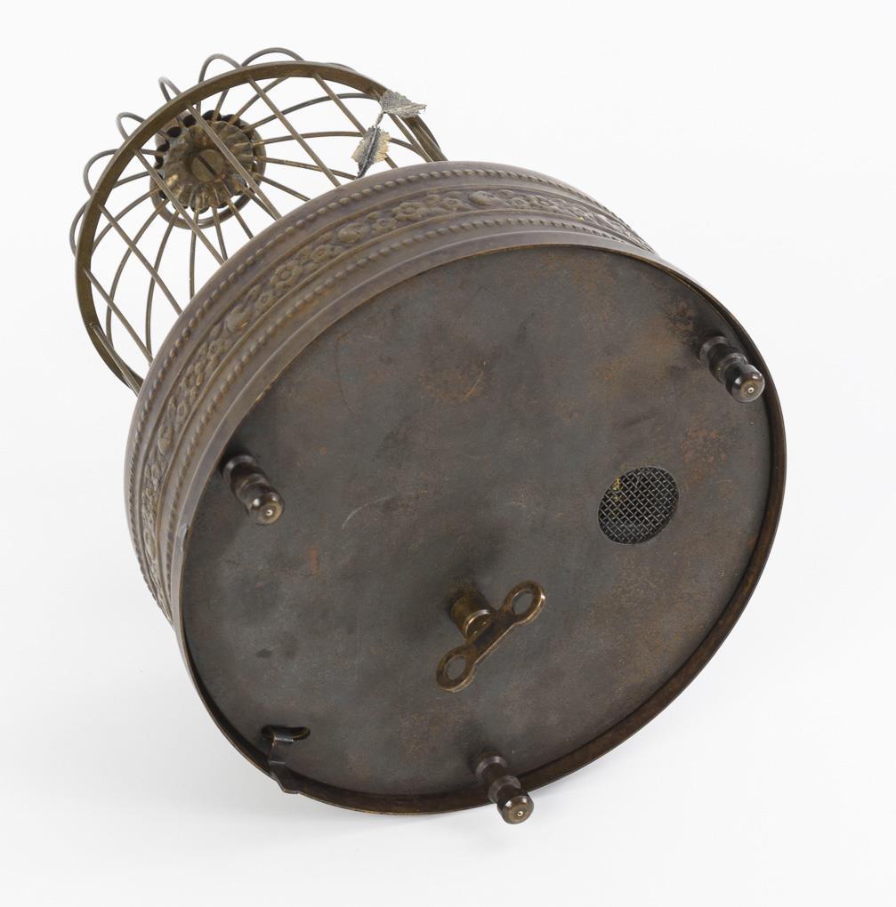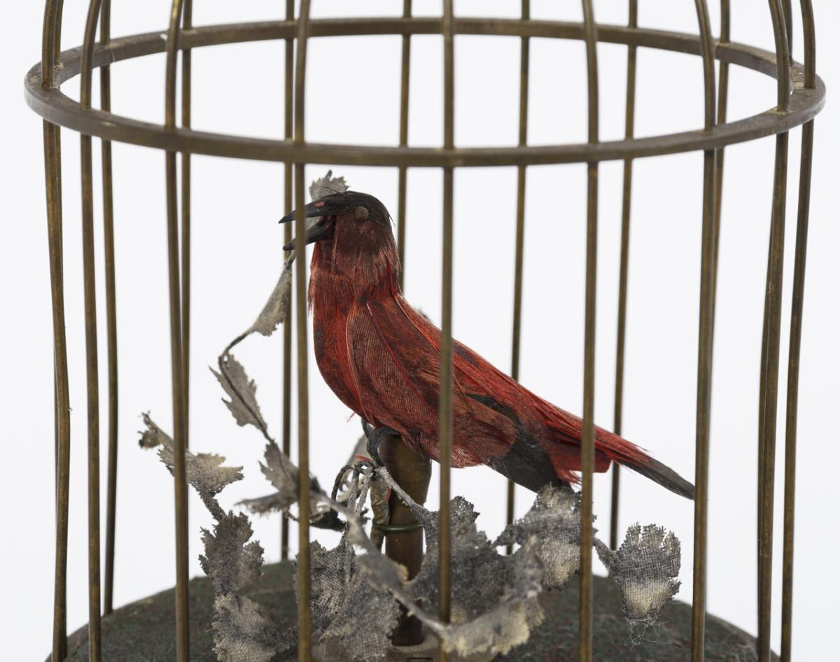 Round cage with floral relief frieze on the base. Inside red bird on a branch chirping, moving tail, head and beak. Features. A little dirty.