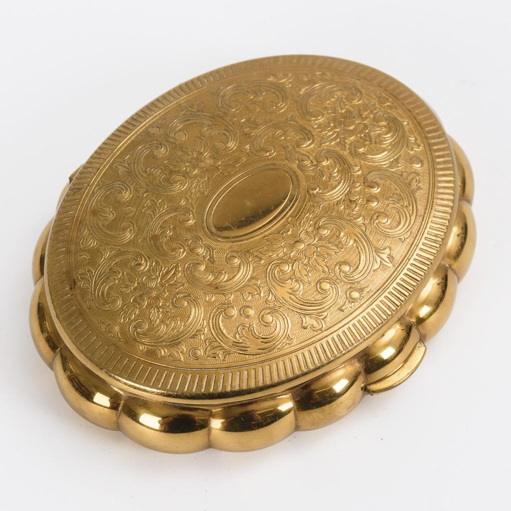 Gold colored box with relief ornament on the hinged lid. Under the inner mirror lockable powder compartment and elevator and lever for the movement. Movement runs slowly.