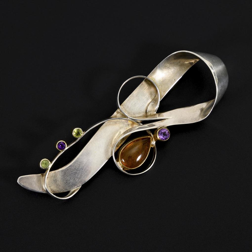 Decorated ribbon brooch with casket-set amber cabochon, 2 amethysts and 2 peridots? Ball hook.