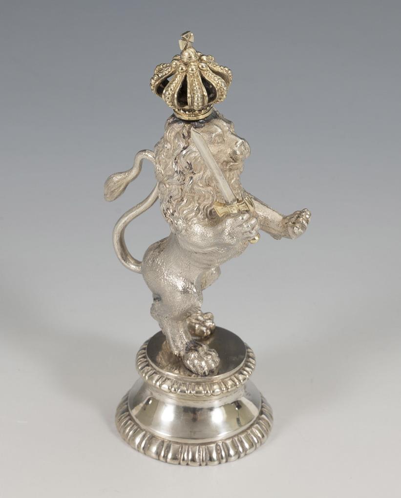 Rising lion with sword and gilded crown, on round base.