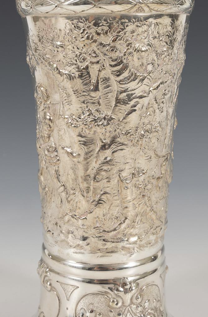 Artfully designed conical cup with historicist relief decoration and partially plastic animal heads, surrounding a relief hunting scene with hunters, hounds and a stag.