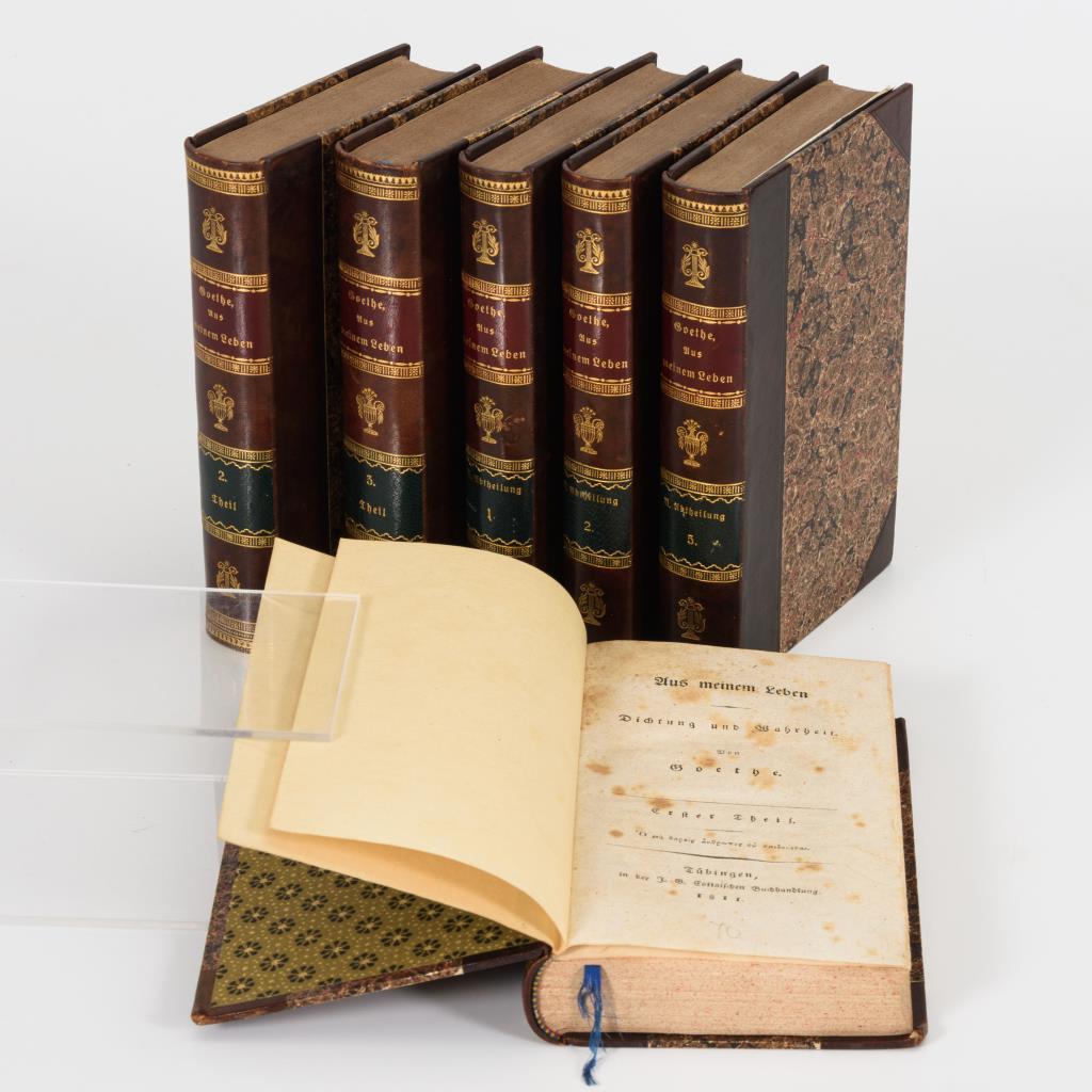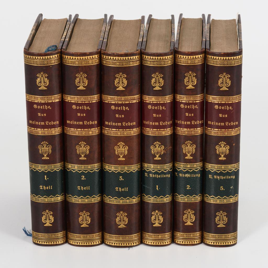Band 1-3: "Dichtung und Wahrheit". Einzeltitel: Griechischer Titel, "Was man in der Jugend wünscht, hat man im Alter in Fülle"; "Es ist dafür gesorgt, dass die Bäume nicht in den Himmel wachsen". / II: Abtheilung: 2x "Auch ich in Arcadien!" (Band 1und 2) und "Auch ich in der Champagne!". (Band 5). Jünger gebundener, goldgeprägter Halbledereinband, kaum Altersspuren.