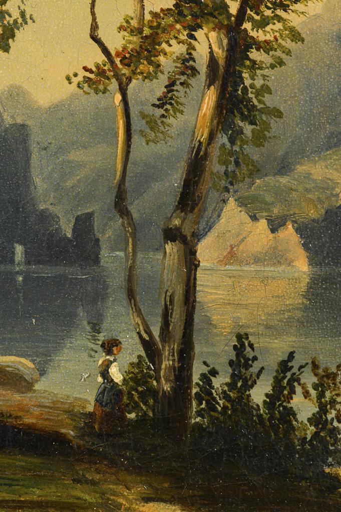 Warm sunlight over the lake with the figures on the shore. Minimal signs of age.