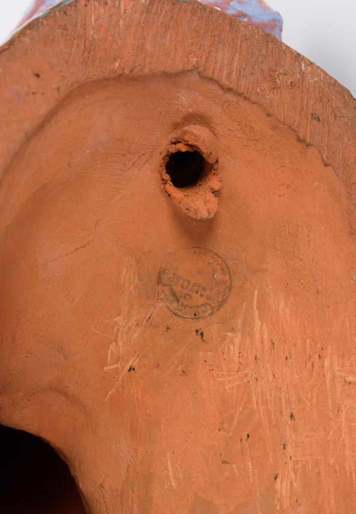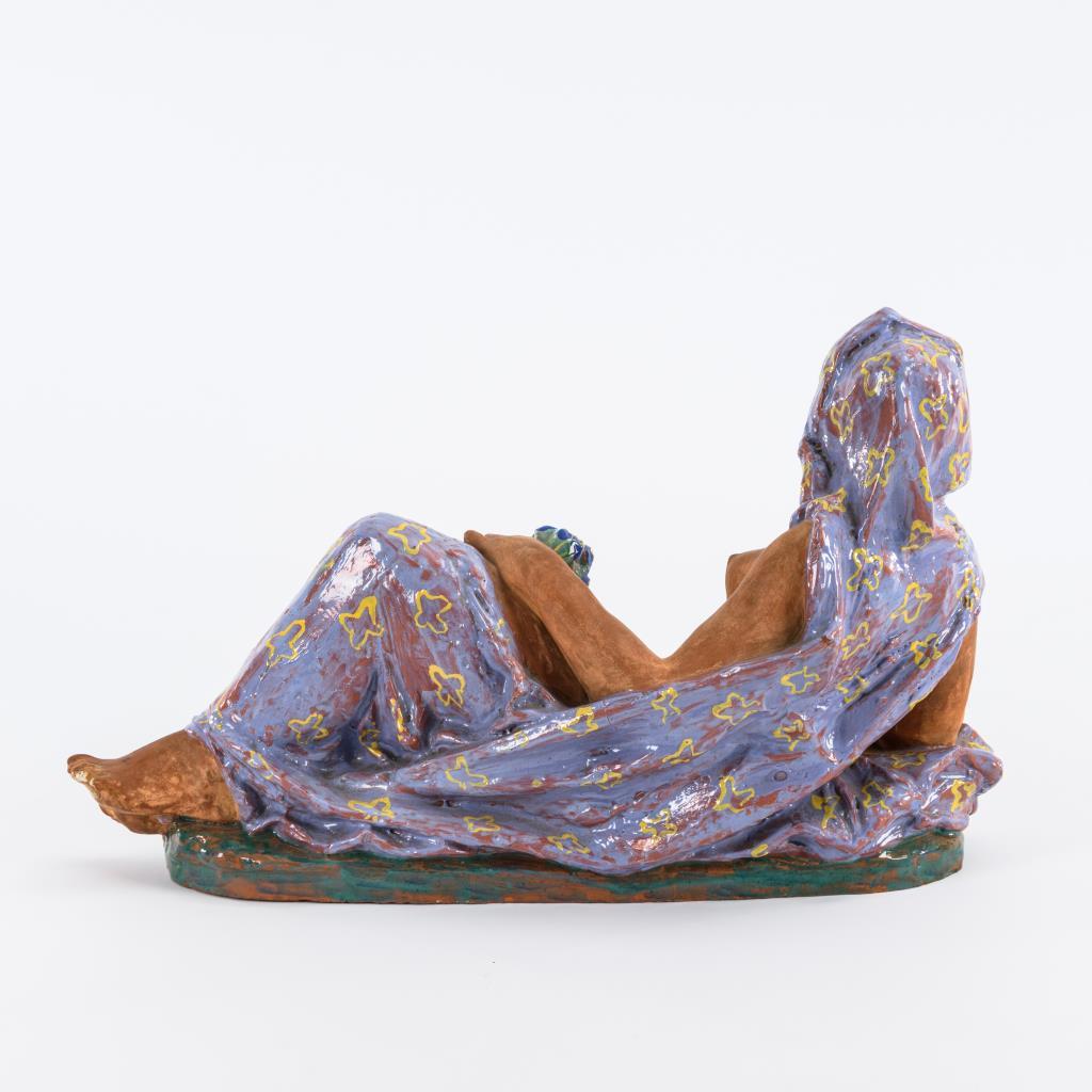 Teils in ein violettes Tuch gehüllter weiblicher Akt mit blauen Blumen, auf grünem Ovalsockel. Partiell leicht bestoßen, linke Zehen geklebt.