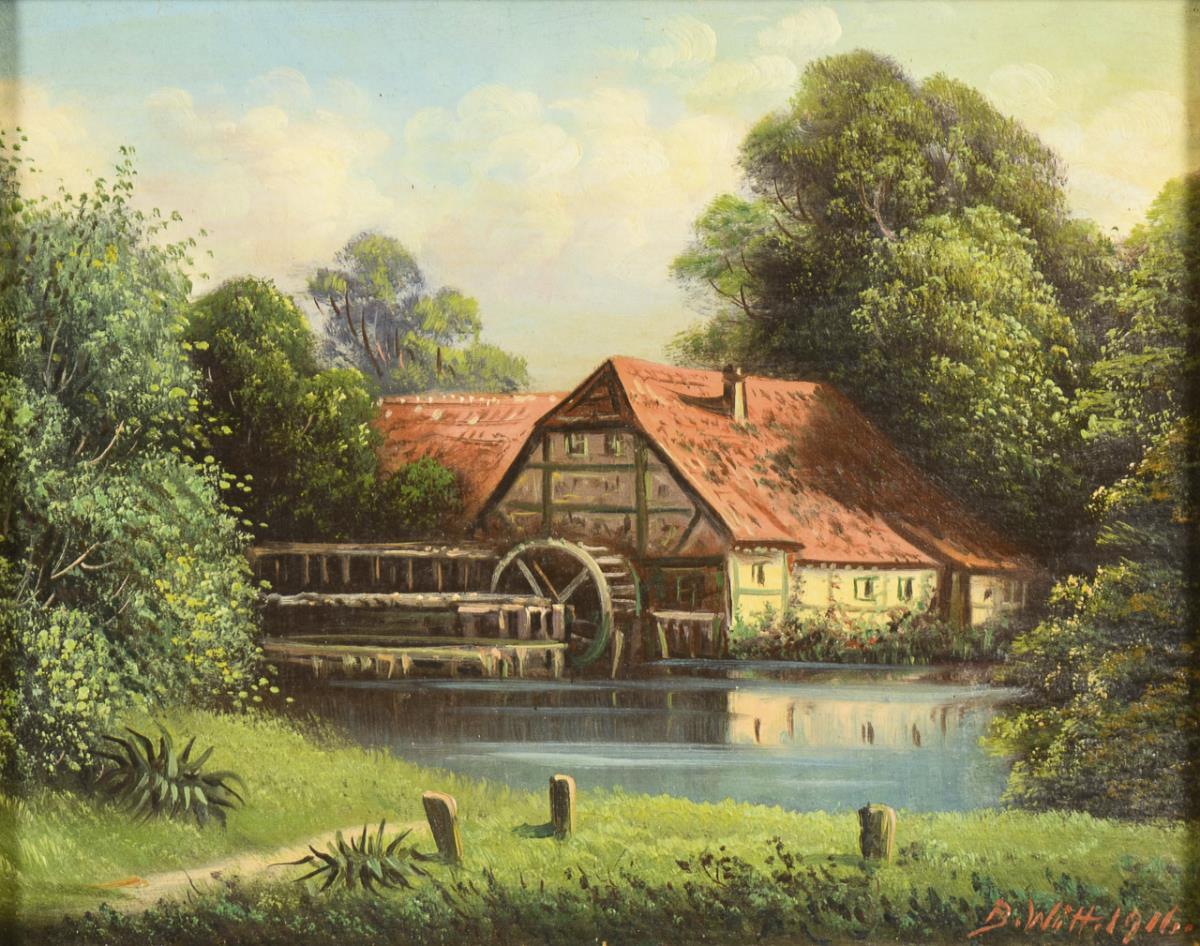 Idyllic view of the mill in Friedrichsruh in the warm sunshine between dense trees.