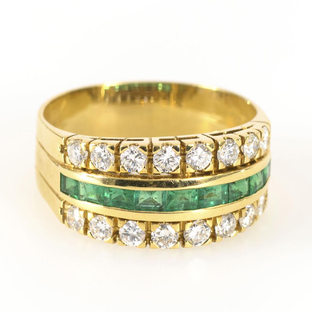 Wide band ring with 9 emerald baguettes between 16 inset diamonds.