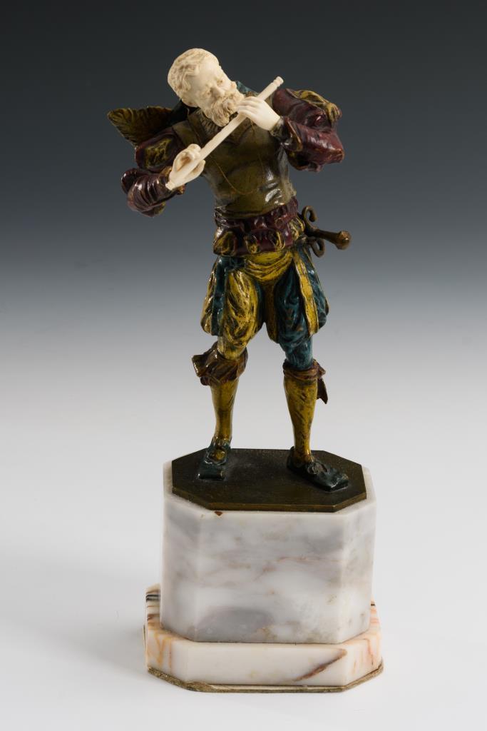 Detailliert gestalteter Mann mit Querflöte. Haarrisse im Elfenbein, einige Fingerspitzen ergänzt/geklebt, Schwert verbogen, Patina leicht berieben.