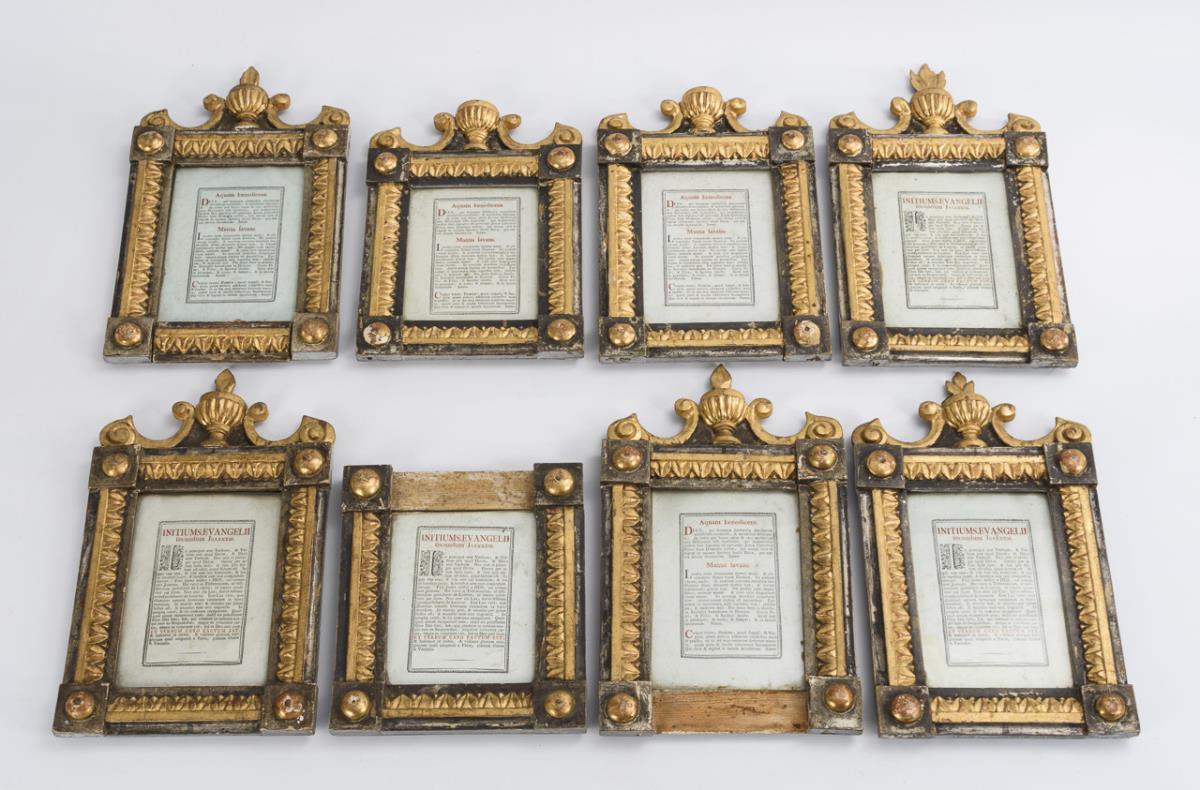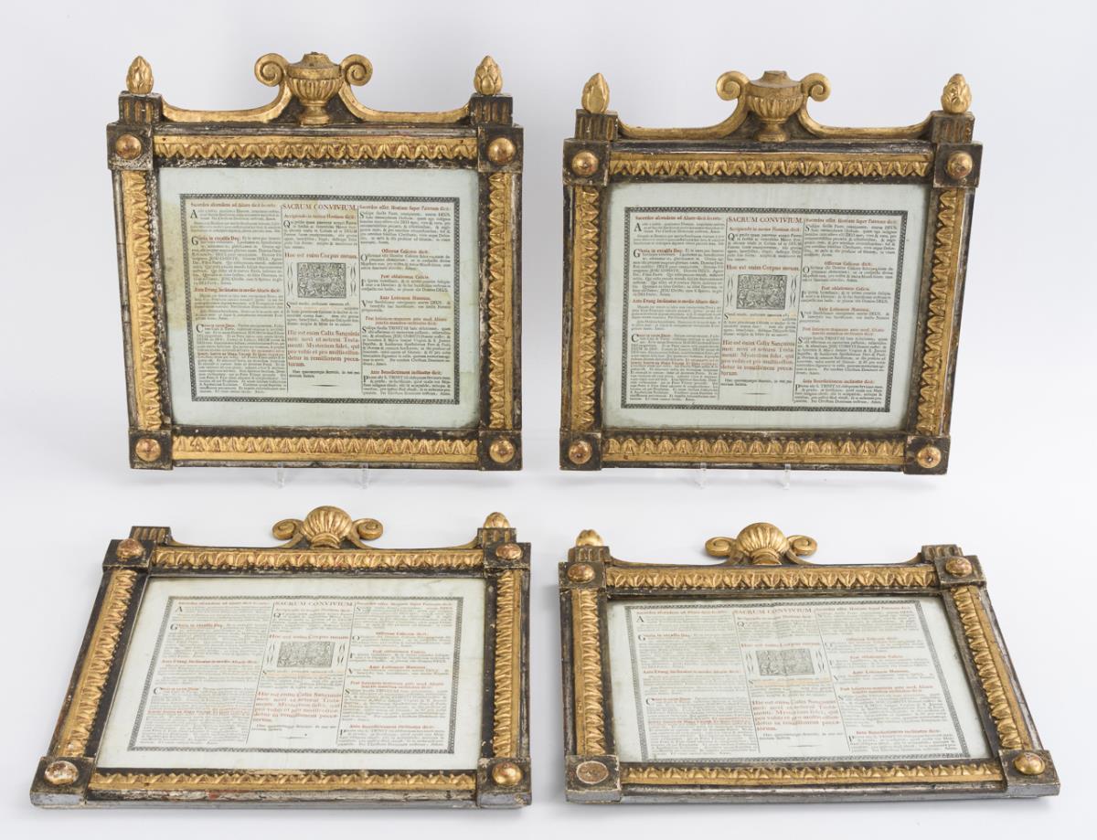 Similar rectangular frames with foliate friezes, hemispheres on the corner squares and crowns with cones and vases. On the back of each orig. wooden back panel, partly pasted with sacred text in Latin. Behind the glazing each sacred text in Latin. Strong signs of age / use, missing parts.