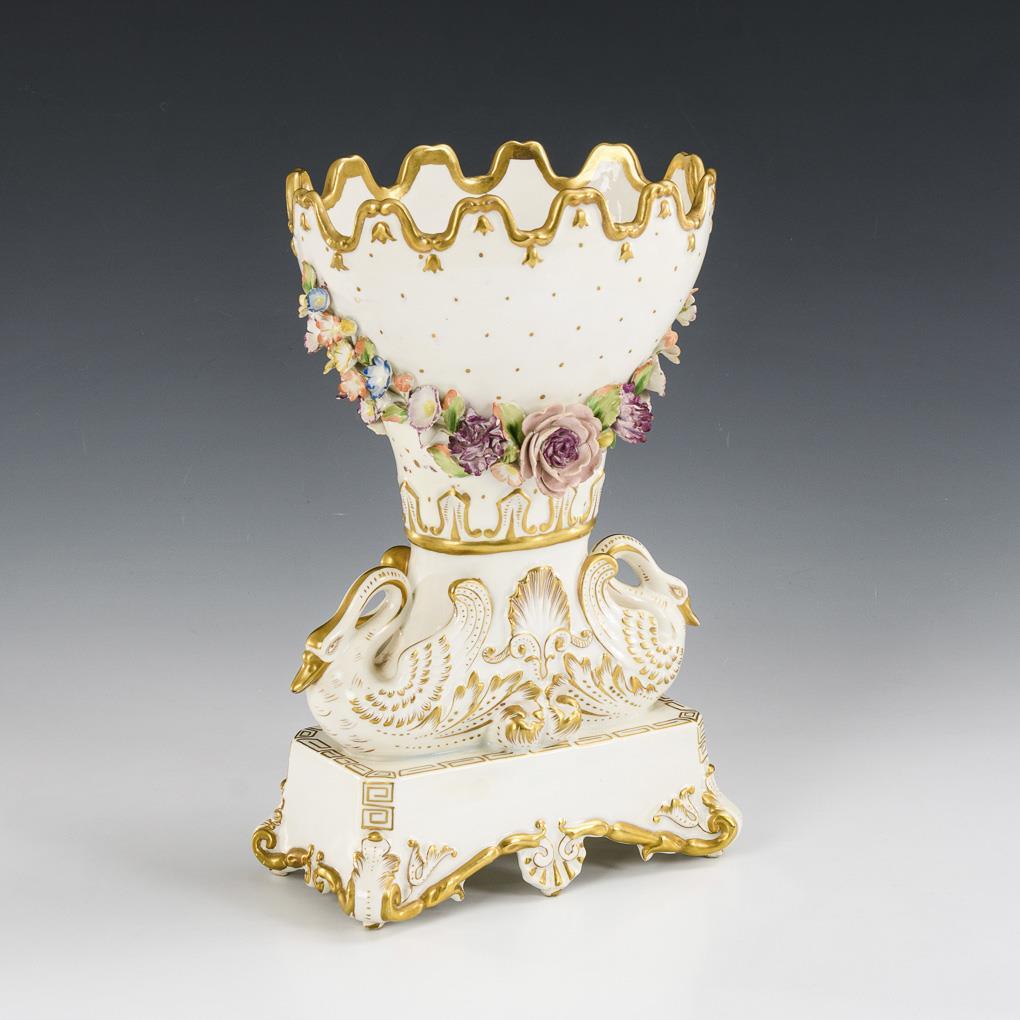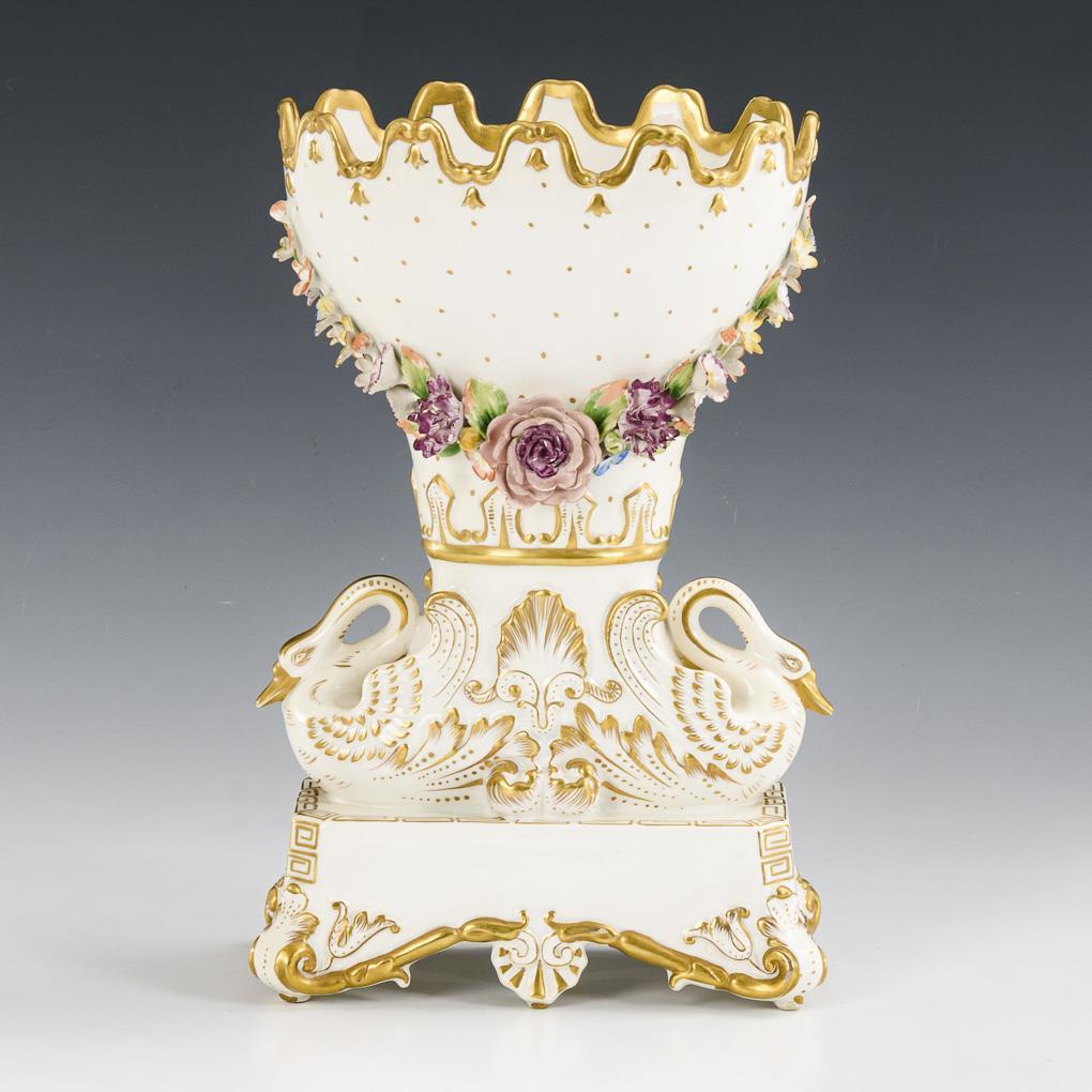 Very finely modeled centerpiece with swans and flowers.