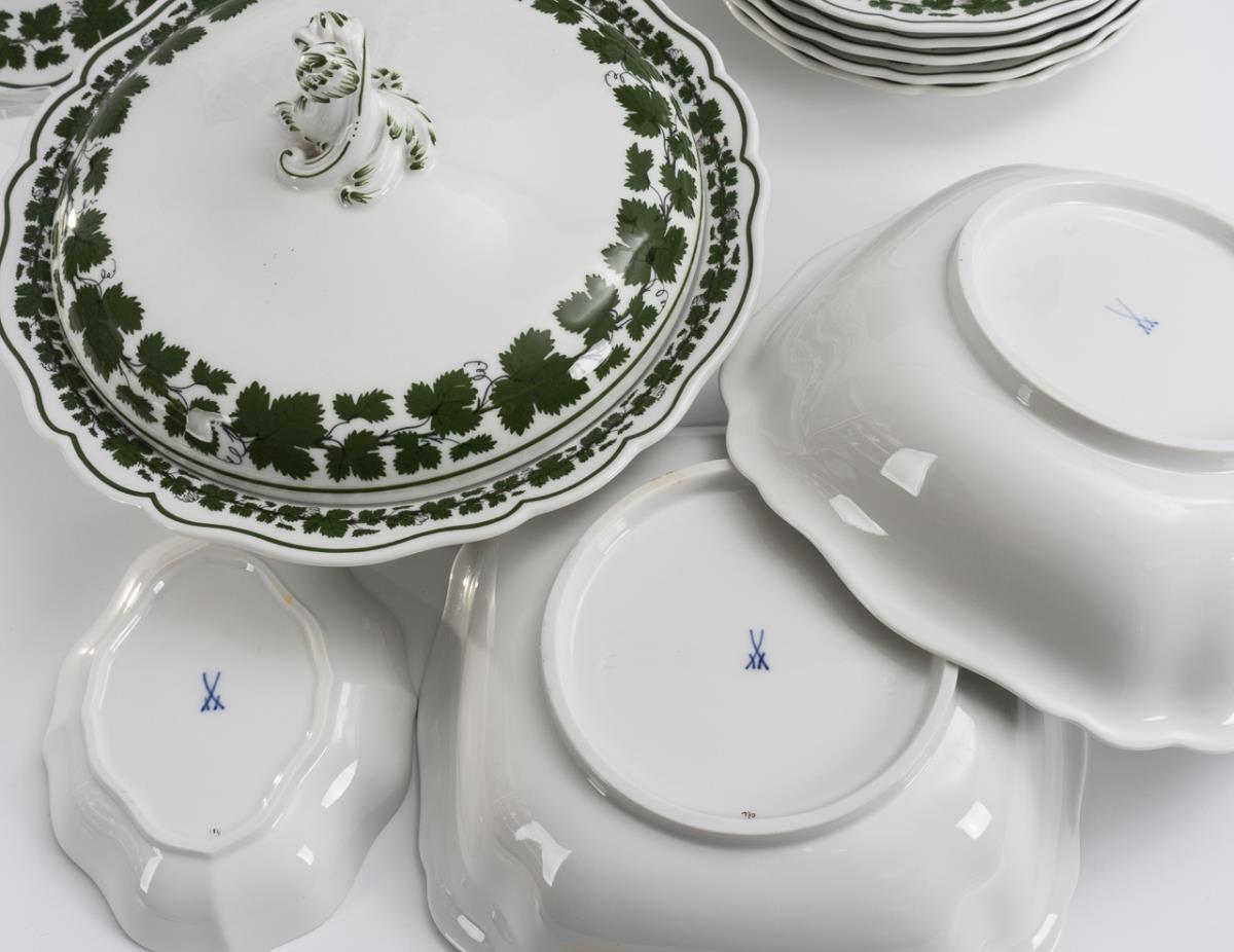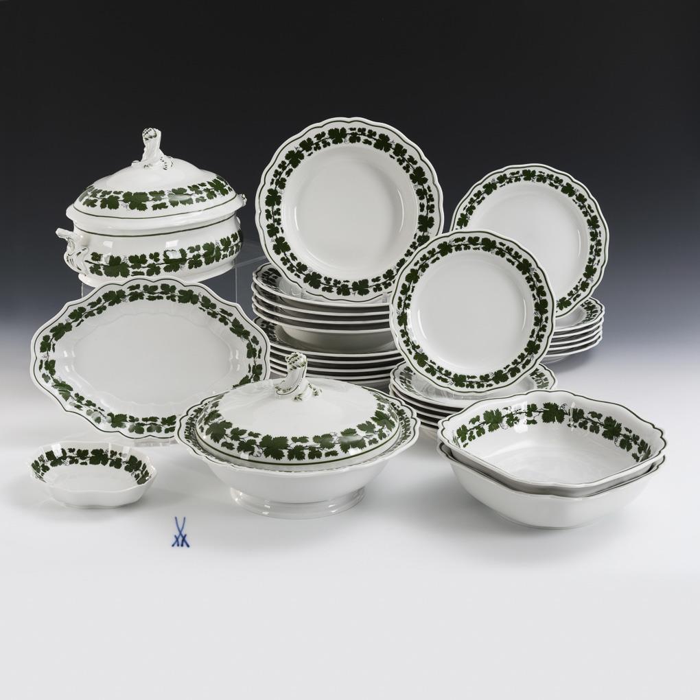 28 parts. Shape "New Cutout". 5 soup plates, 5 dinner plates, 6 appetizer plates, 6 salad plates, 2 square bowls (22 x 22,5 cm), 1 lidded bowl (Ø 26,5 cm), 1 tureen (L 30 cm) and 2 different oval bowls (L 15,5 and 27,5 cm).
