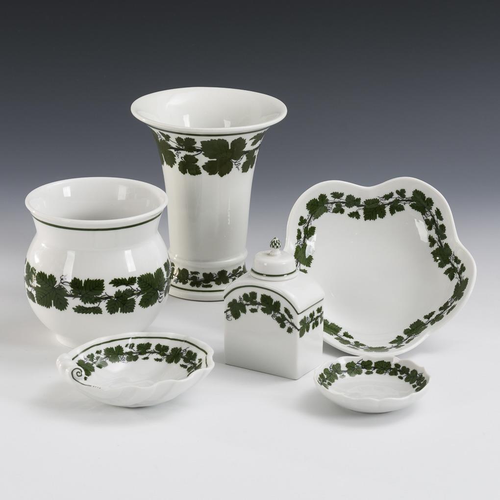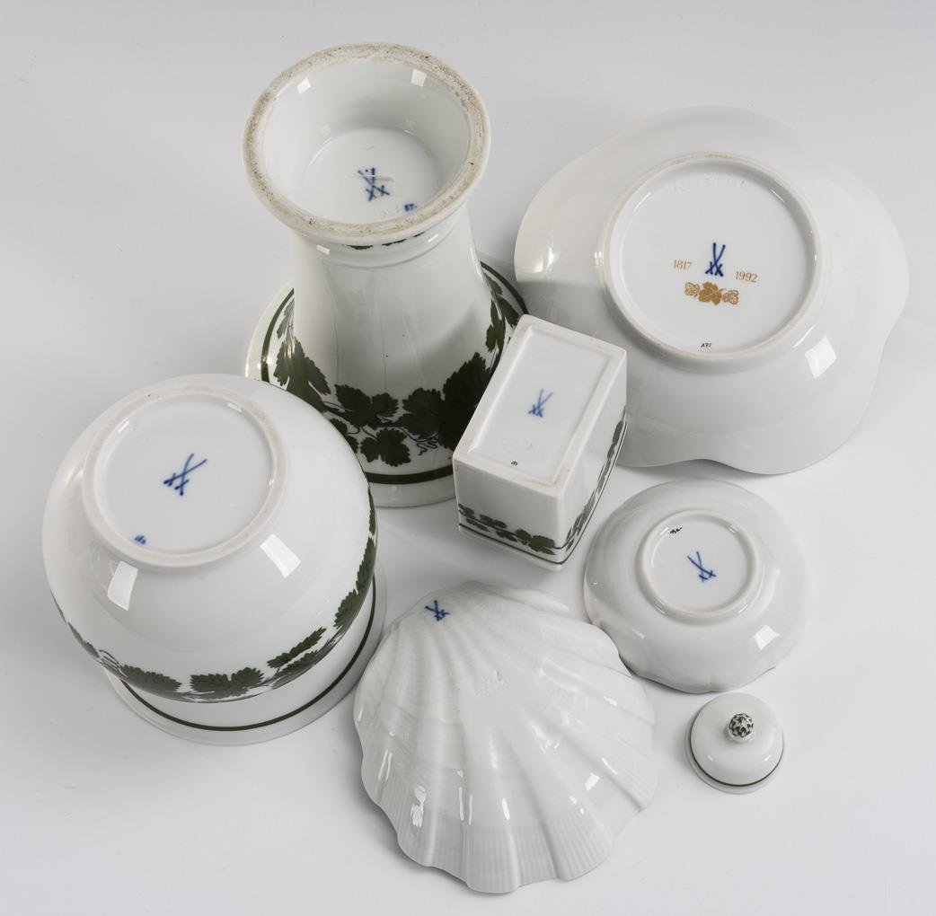 2 vases, tea caddy and 3 small bowls with vine leaves decor. Meissen.