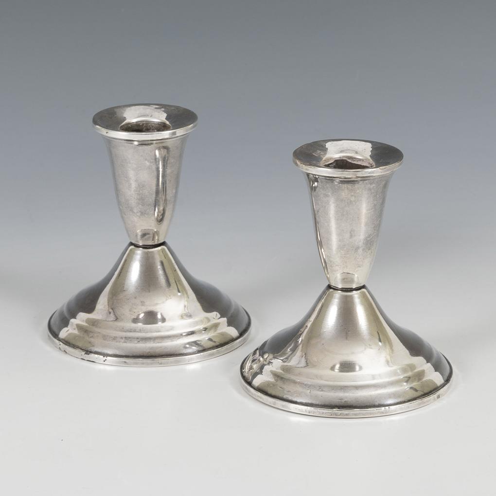 Smooth, 1-flame table candlesticks on round base. Signs of use, small dents.