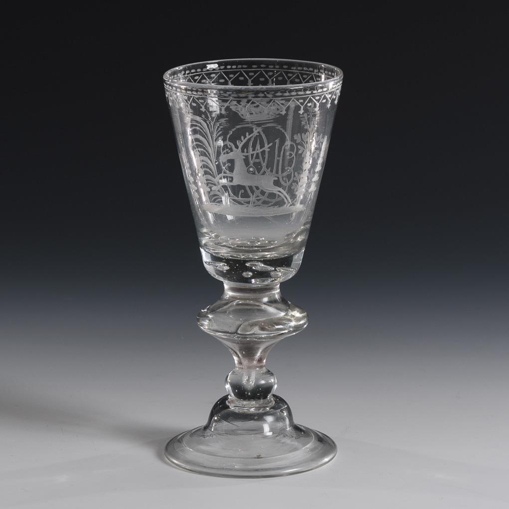 Tapered dome with an engraved bubble wreath in the dome base, nodded hollow stem, round foot with everted rim; demolition. On the dome the engraved representation of a jumping stag and a ligatured monogram.