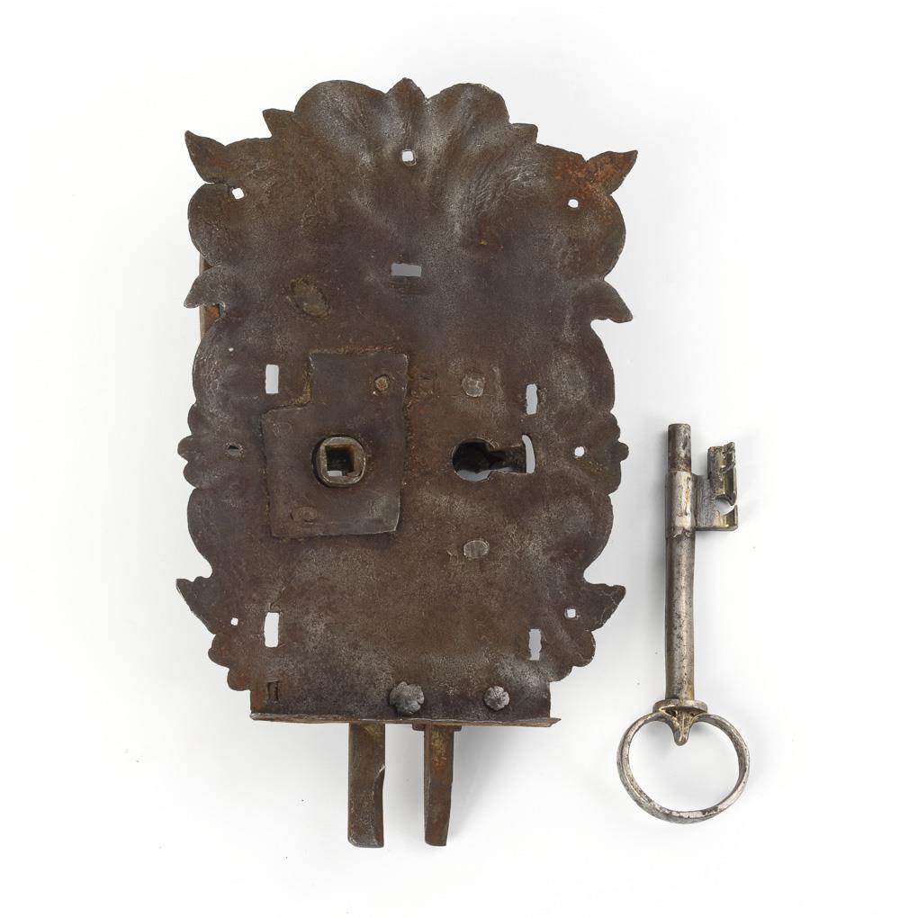 Curved lock base with pick, lever latch moved by the lever handle or lever handle follower; slanted latch operated by key or deadbolt. Partly existing Einingericht. Lock repaired, traces of soldering on the key, signs of age / use.