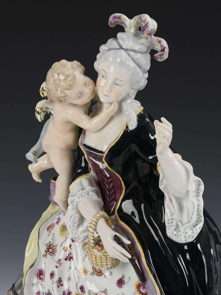 Standing lady with flower basket and fan, on her right side a putto kissing the lady floating. Fan handle, 1 finger and basket handle restored.
