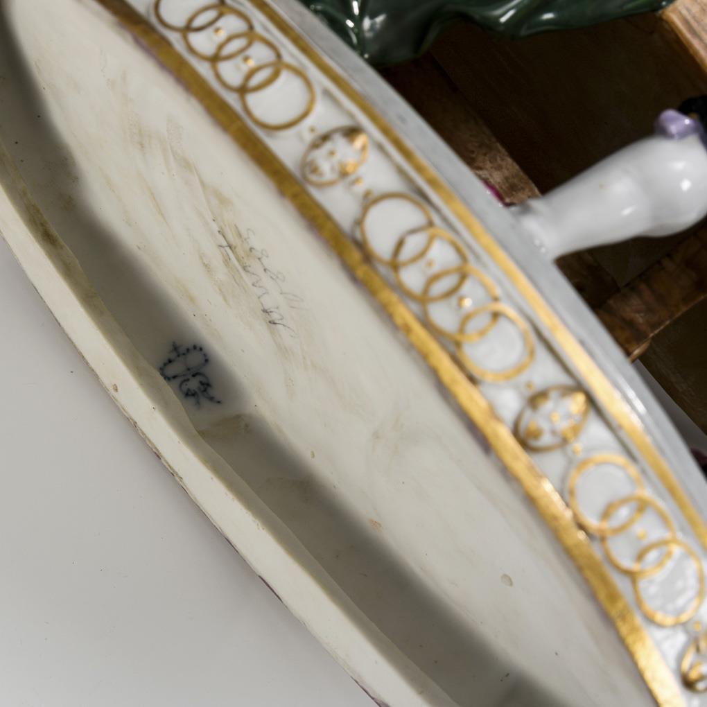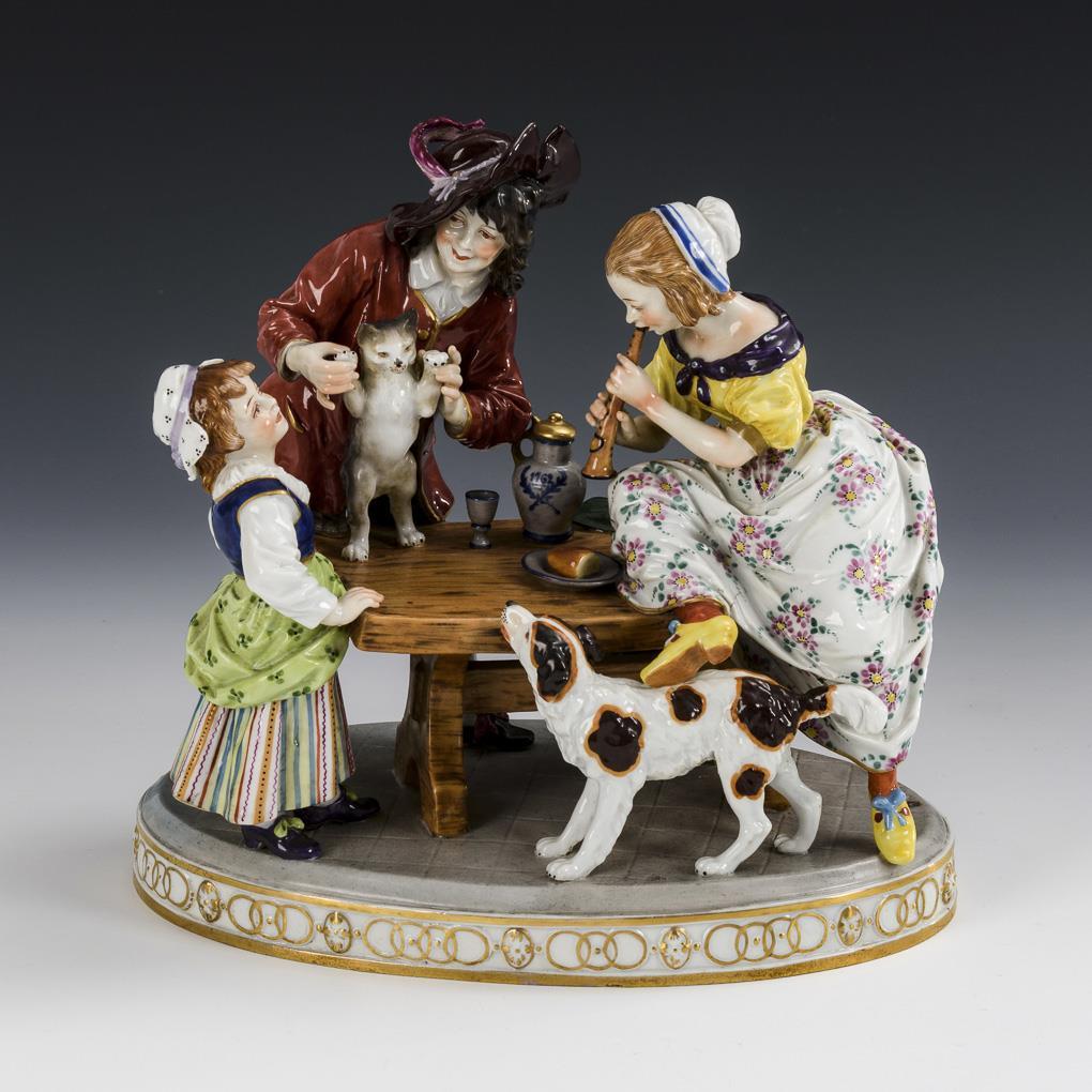 Family grouped around a table: the woman playing a flute, the man dancing with the cat on the table.