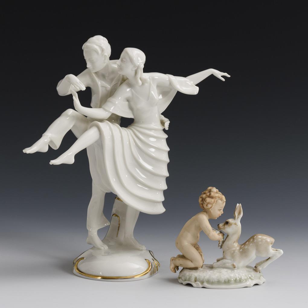 1x design Carl Werner (1895-1980), inscribed: young couple in dancing pose. / 1x design Karl Tutter (1883-1969), inscribed: before a fawn kneeling putto with flowers. 2 fingers restored on the dancing couple.