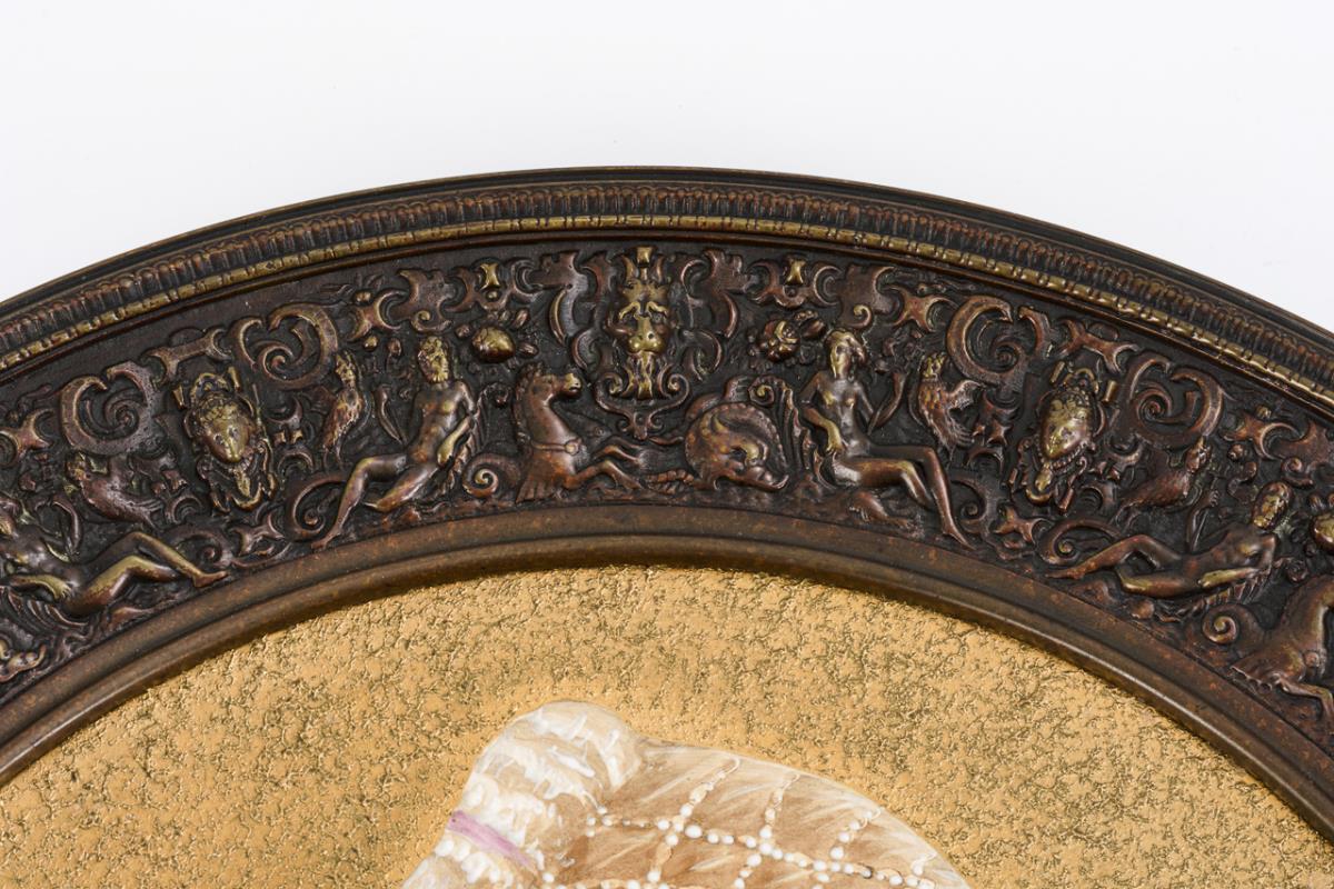 Historicizing profile image of a young woman against a gold-colored textured background. Reliefed bronze frame in Renaissance style with grotesques, mascarones, nymphs and scrollwork, with suspension.