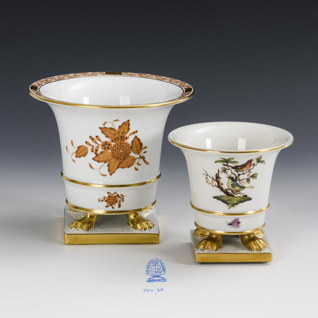 Craters vases with four paw feet, on square plinth. 1x with Indian floral painting in brown, 1x with red shield decor.
