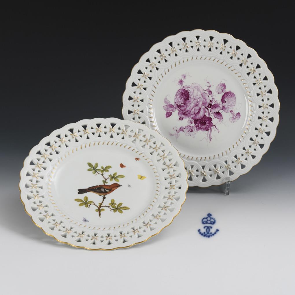 Flat plate with ring-pierced flag. 1x with bird painting and 1x with a purple painted floral bouquet.