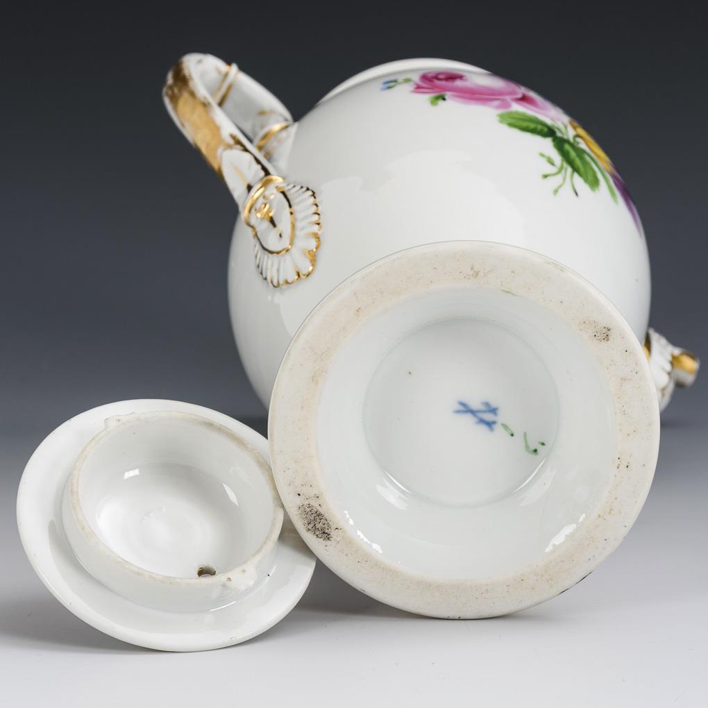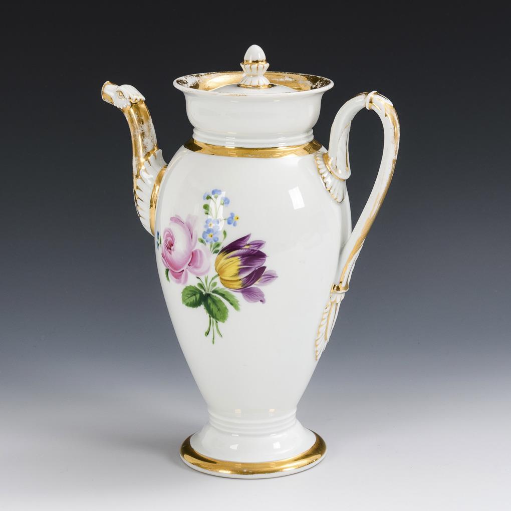 Ovoid jug with palmette handle, tubular spout and knob lid. On both sides a bouquet of flowers with tulip, rose and forget-me-not. Both lid noses bumped, gold rubbed.