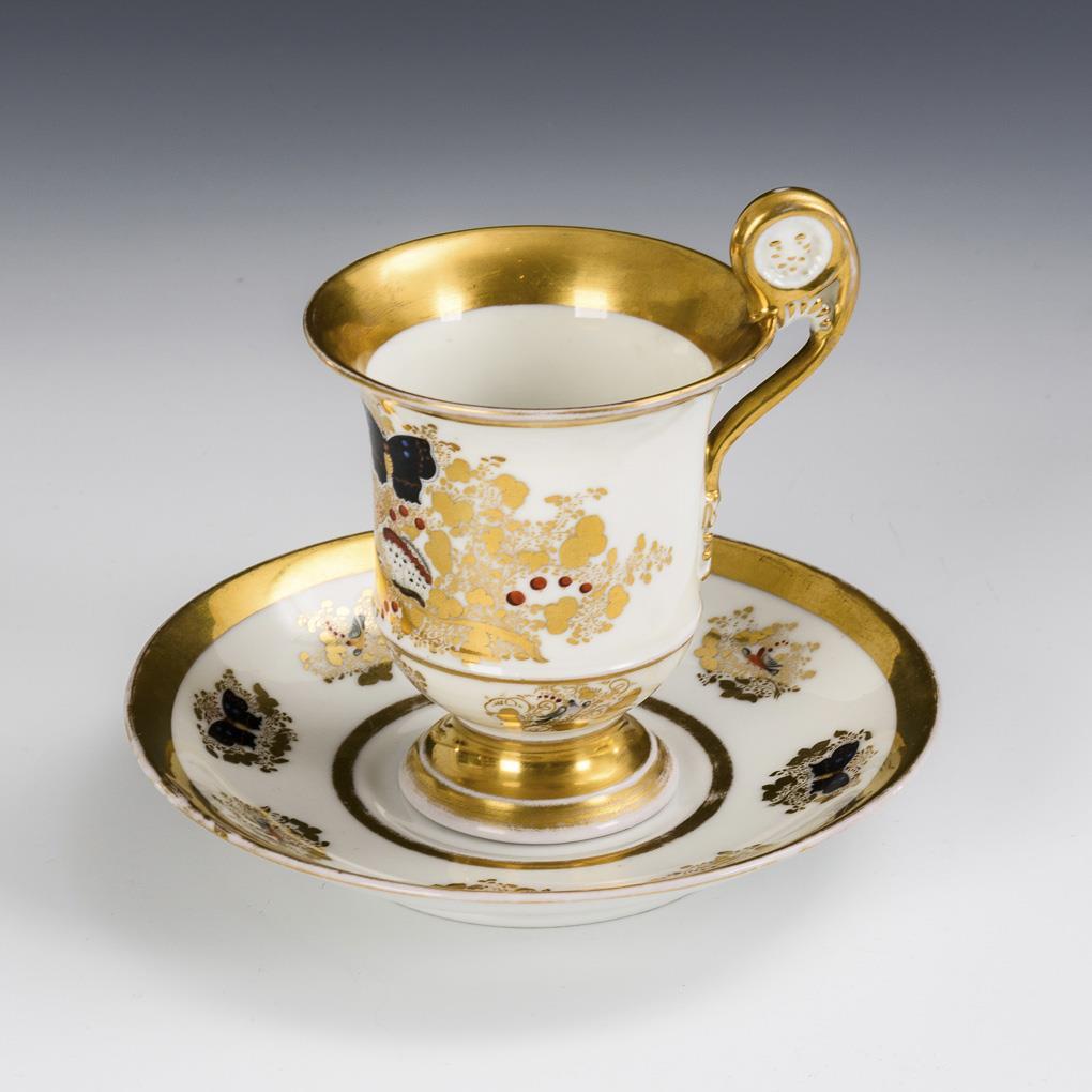 Polychrome painted, gold decorated. H cup 11 cm, Ø original saucer 14.5 cm.