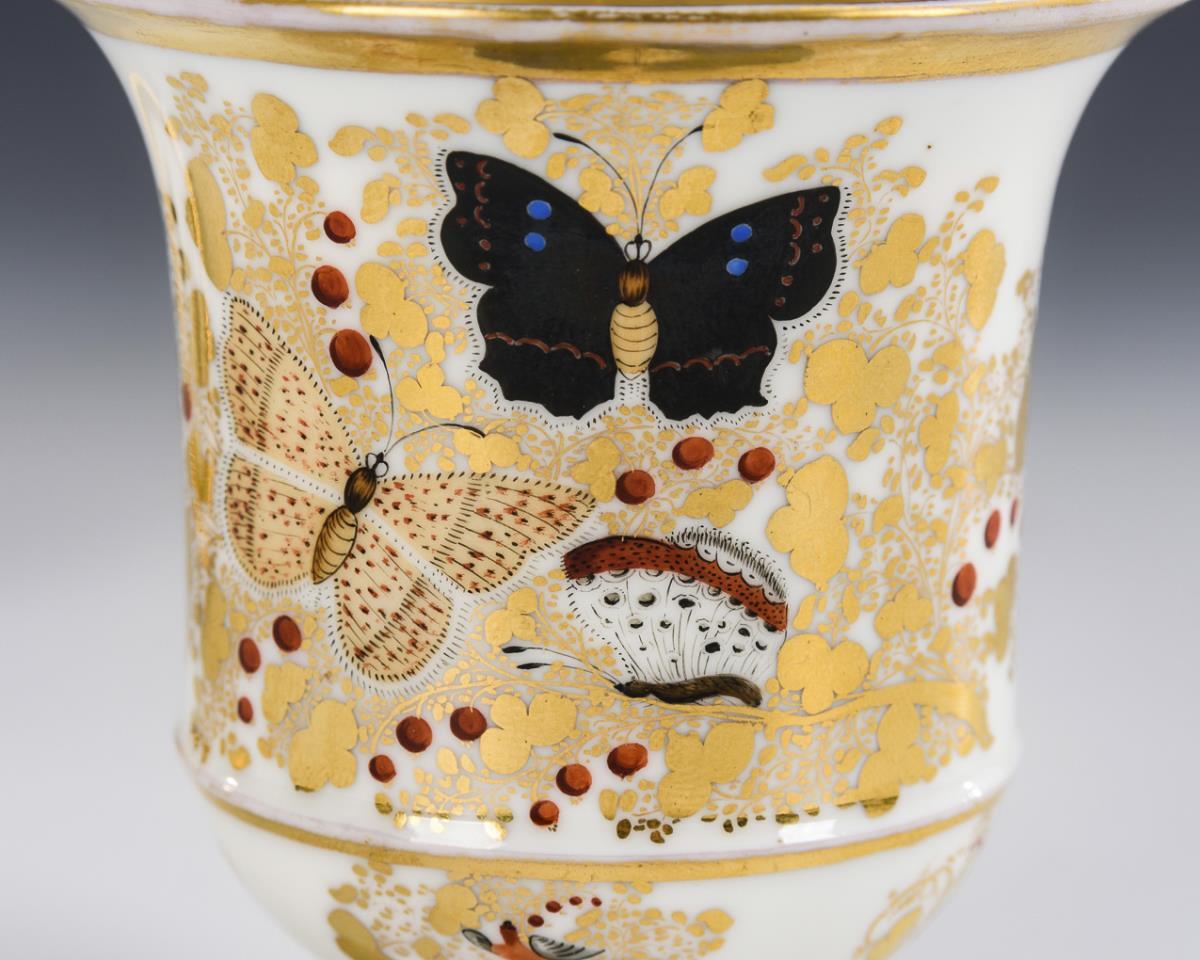 Footed bell cup with rosette handle. With the depiction of butterflies between vegetal gold painting. Minimal gold abrasion.