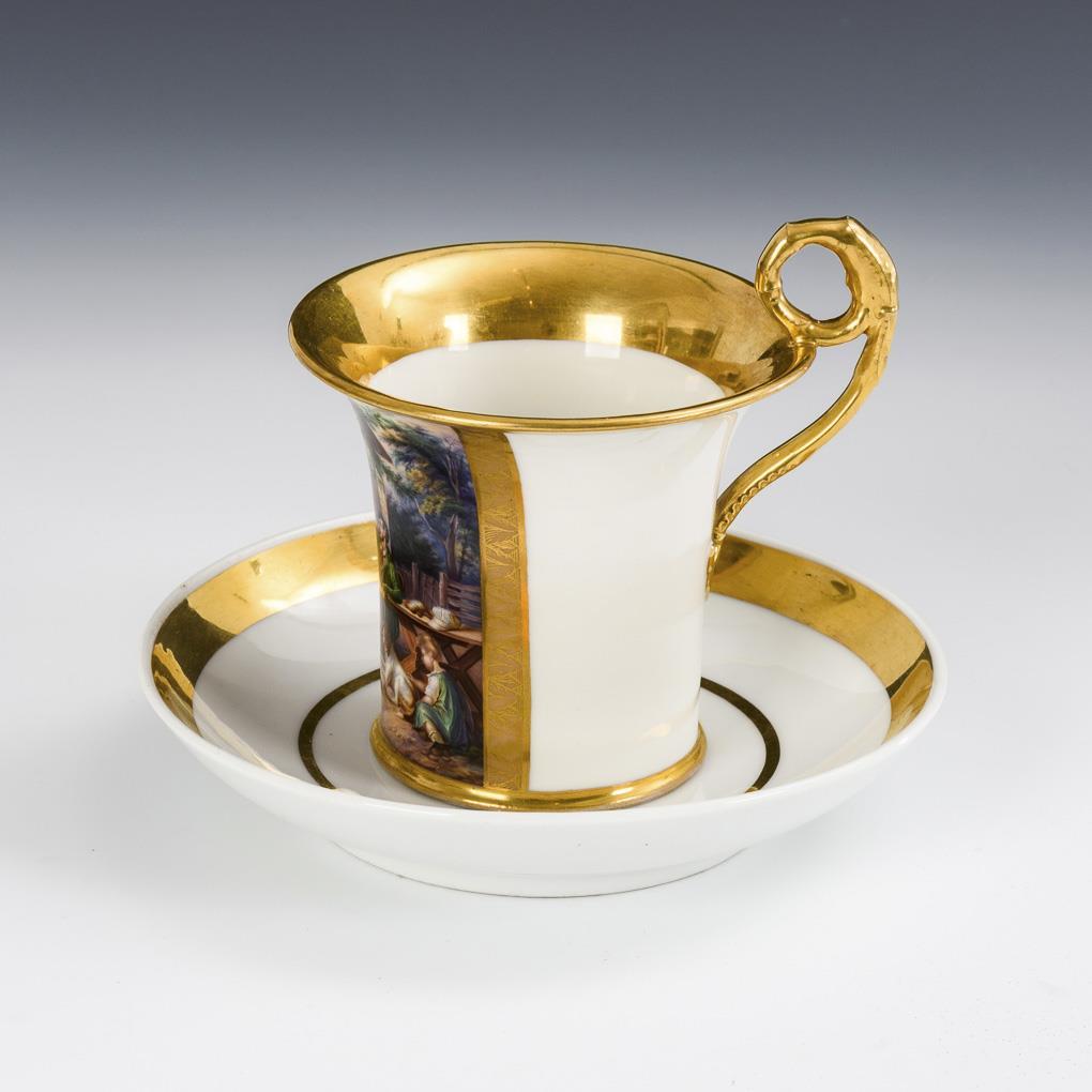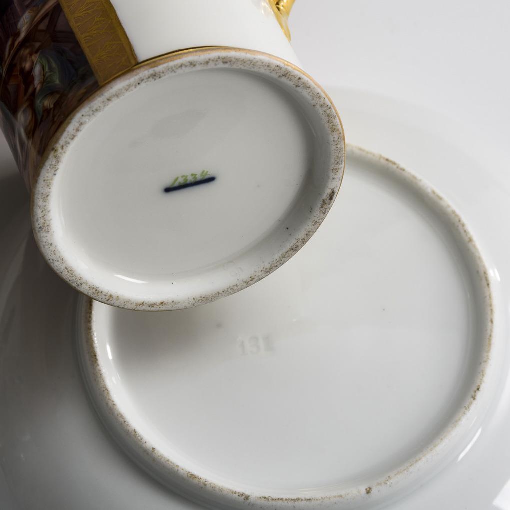 Polychrome painted, gold decorated. H cup 12 cm, Ø supplemented saucer 17 cm.