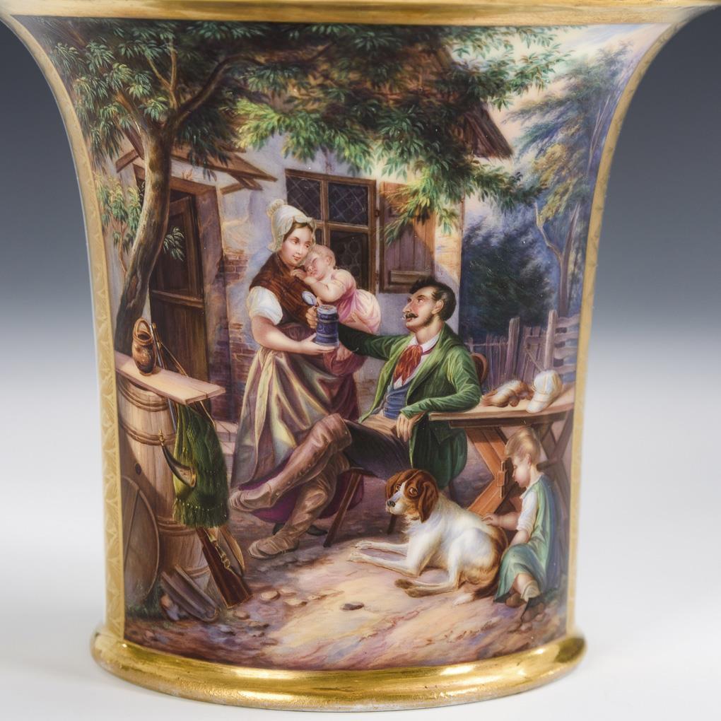 Crater cup with palmette handle. On the front a gold-framed rectangular cartouche depicting a family in front of a forest house.