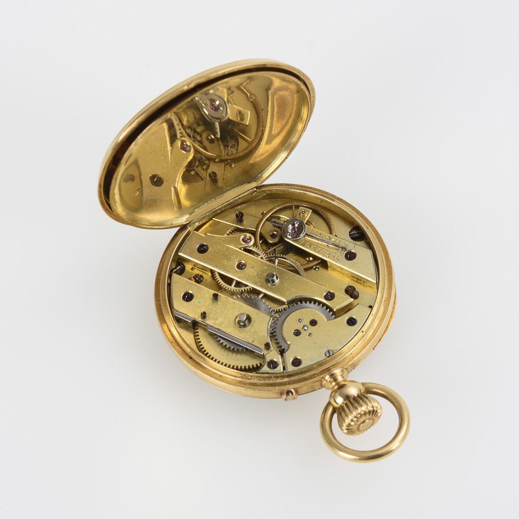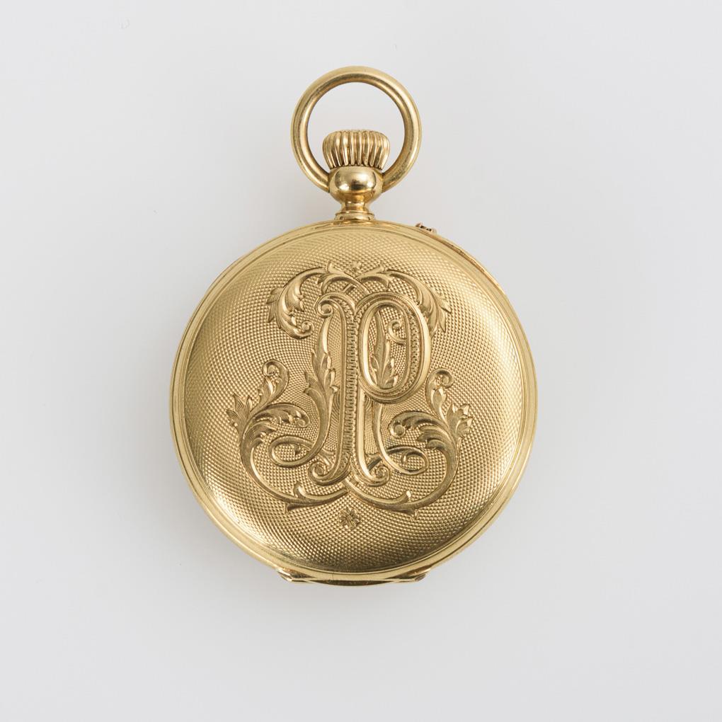 Lépine case with guilloché back cover and ligatured monogram, gold dust cover. Minimal signs of wear.