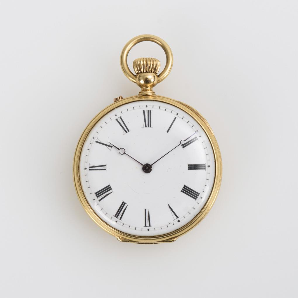 Unmarket, grained gilt movement with cylinder escapement, hoop balance, blued Breguet hairspring, crown winding, running. White enamel dial with Roman numerals, minute crown and blued Breguet hands.