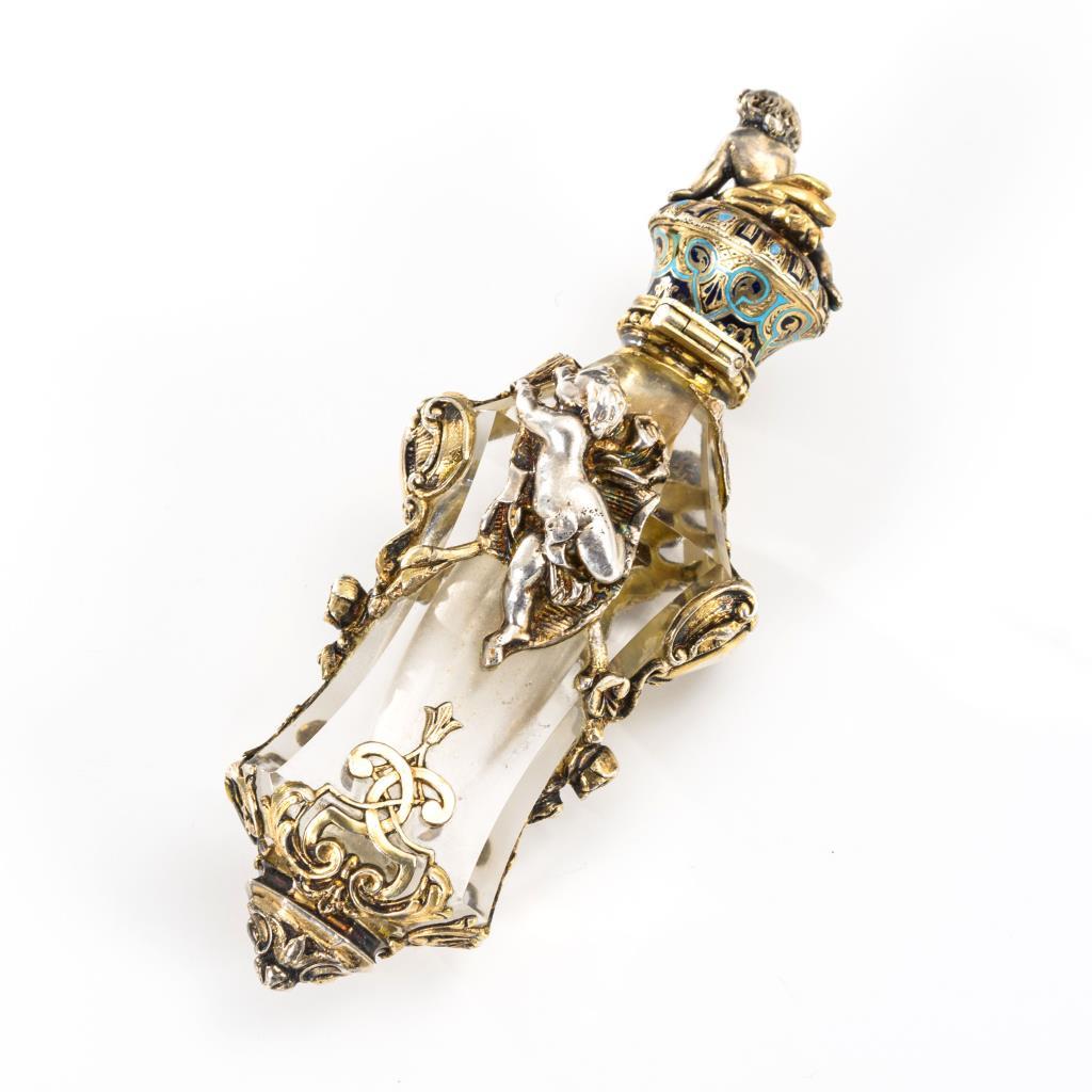 Silber geprüft, Steinschnitt-Flakon mit teils vergoldeter Montierung.H 11 cm.