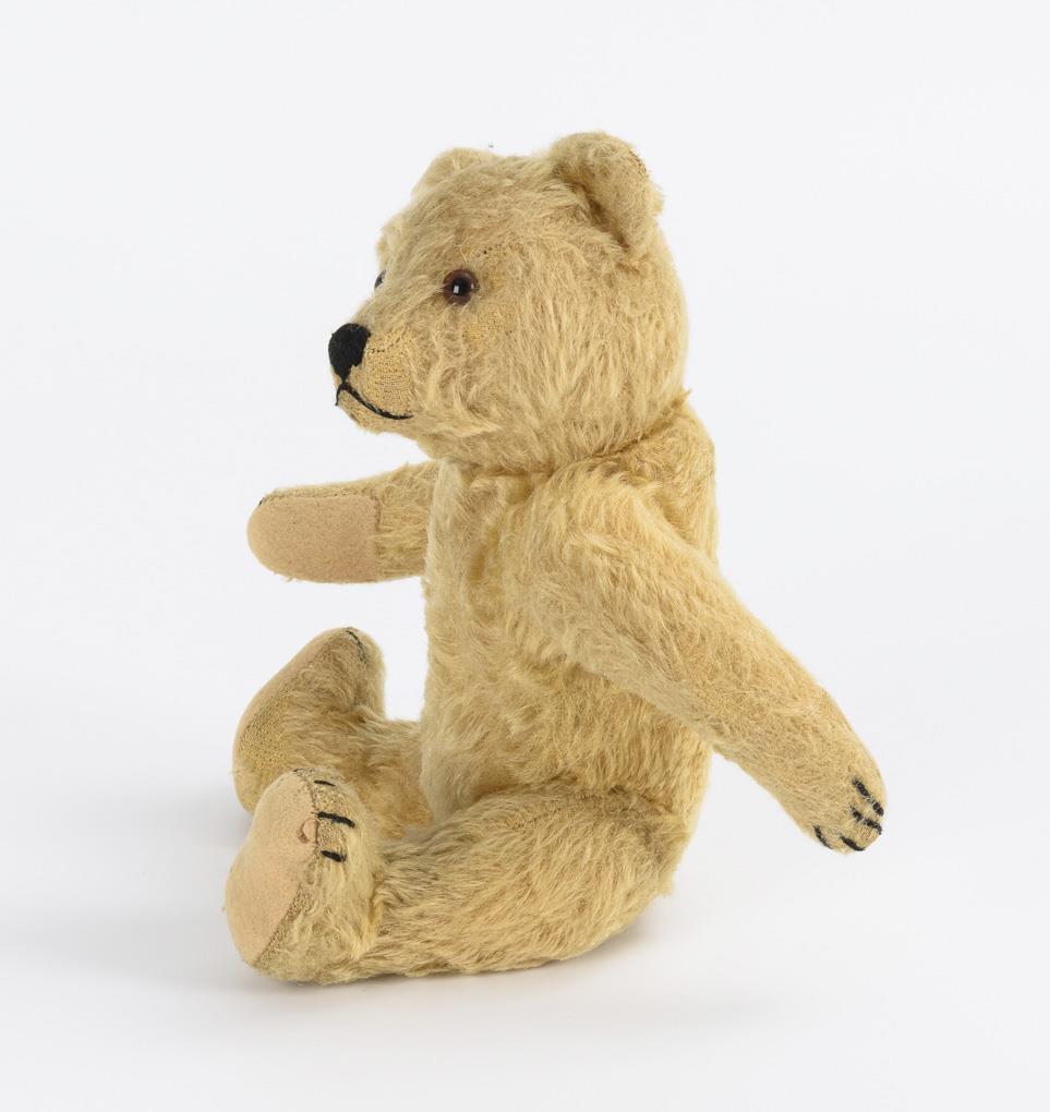 Turnable head with glass eyes, limbs with disc joints. Slight signs of age, muted print voice, 1 small hole on left front paw.