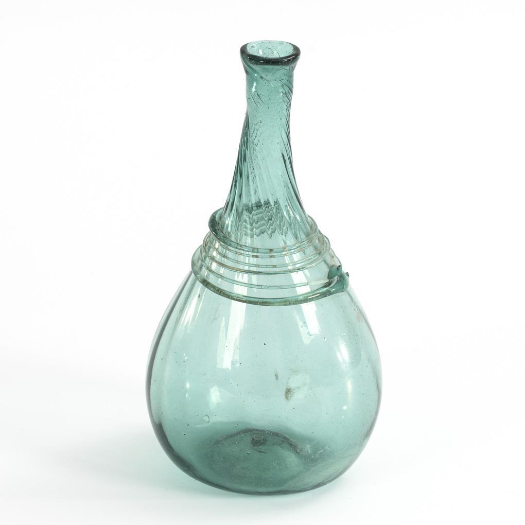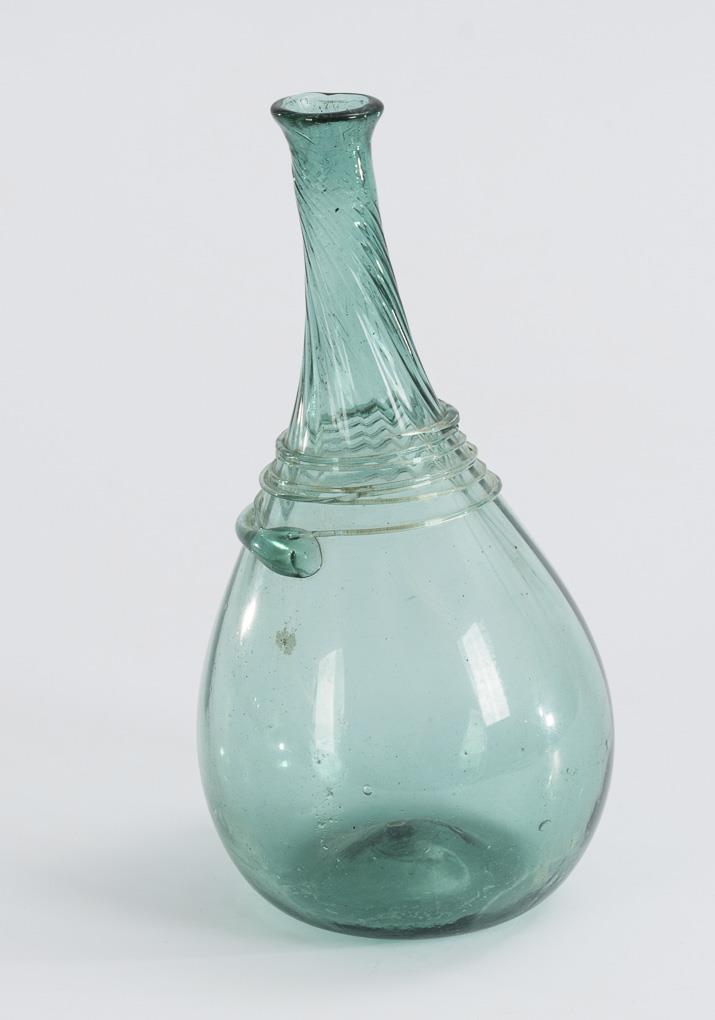 Spiral-optic blown pear bottle with slanted stand, made of blue-green glass with spun glass thread on the shoulder; demolition.