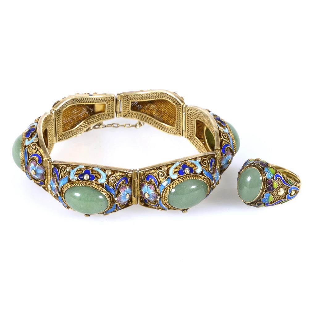 Chinese bracelet and ring with jade and enamel.