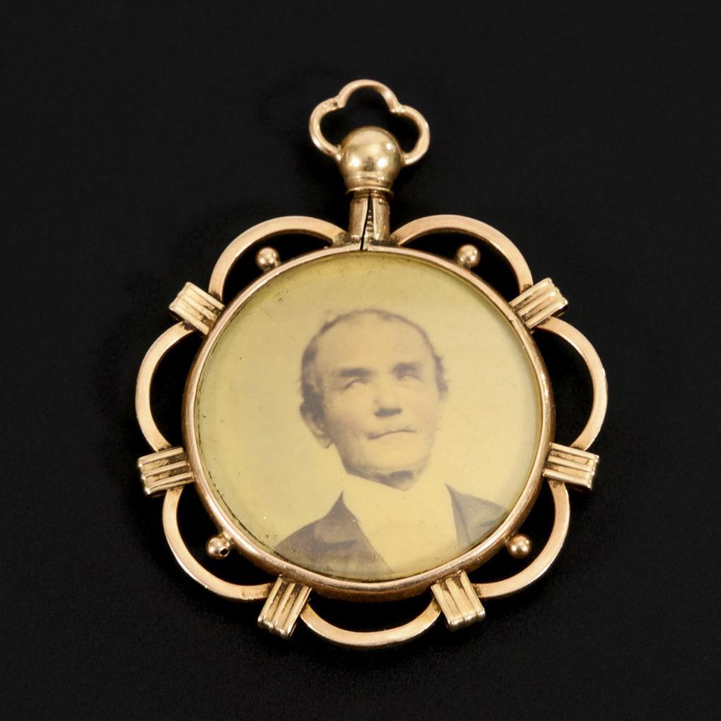 Both sides glazed medallion in decorative frame with original photo inlays. Screw cap.
