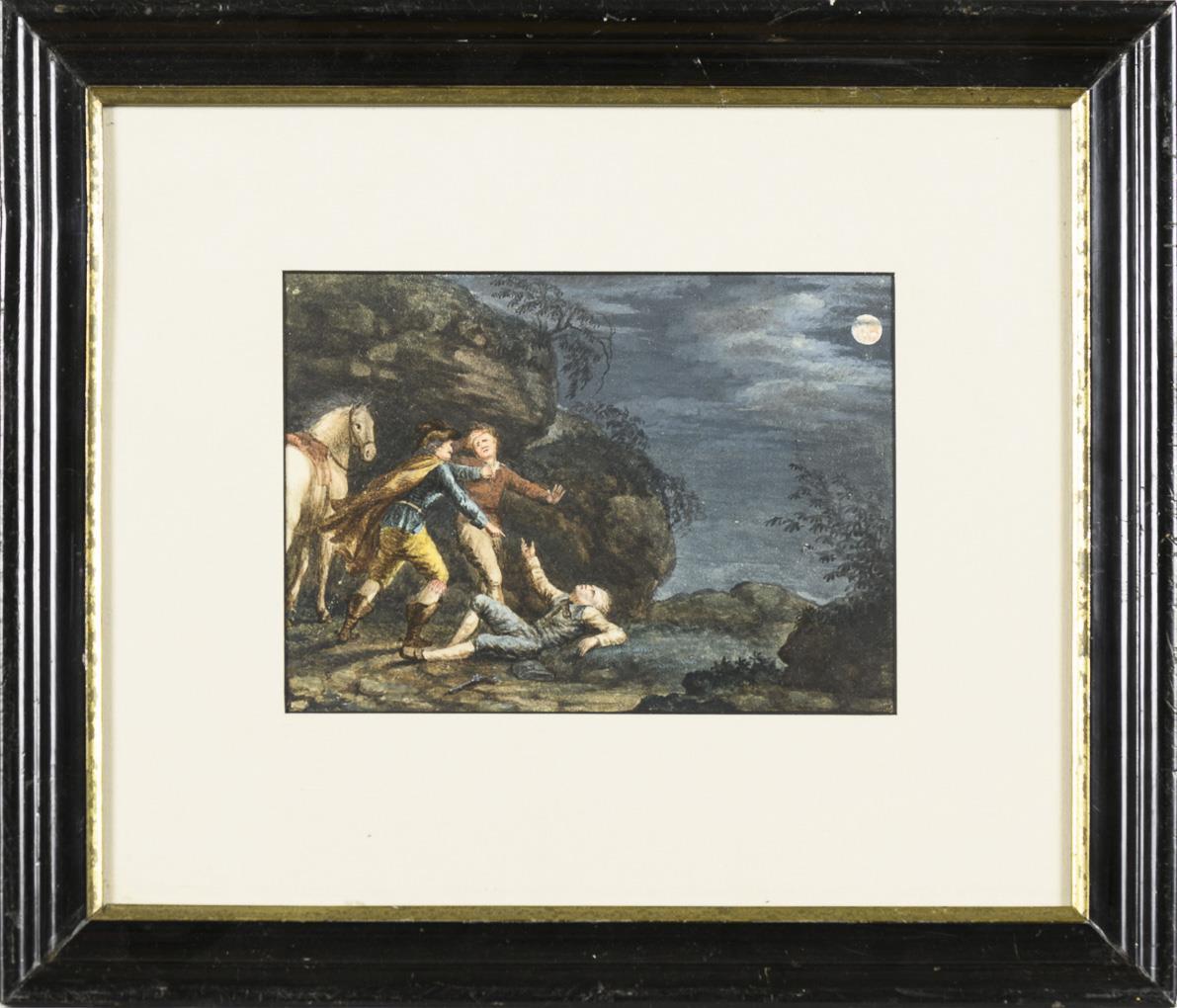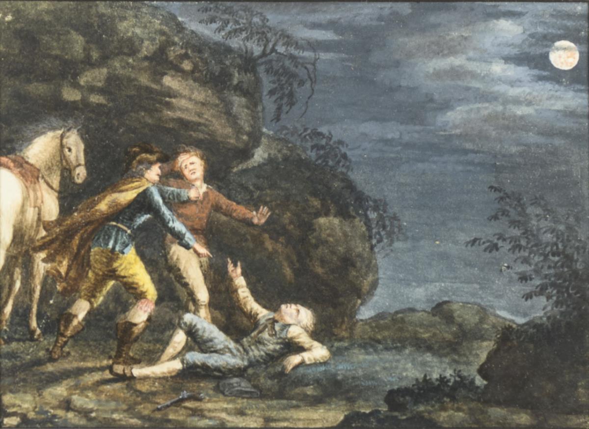 Three men in the mountains in a melee under the full moon.