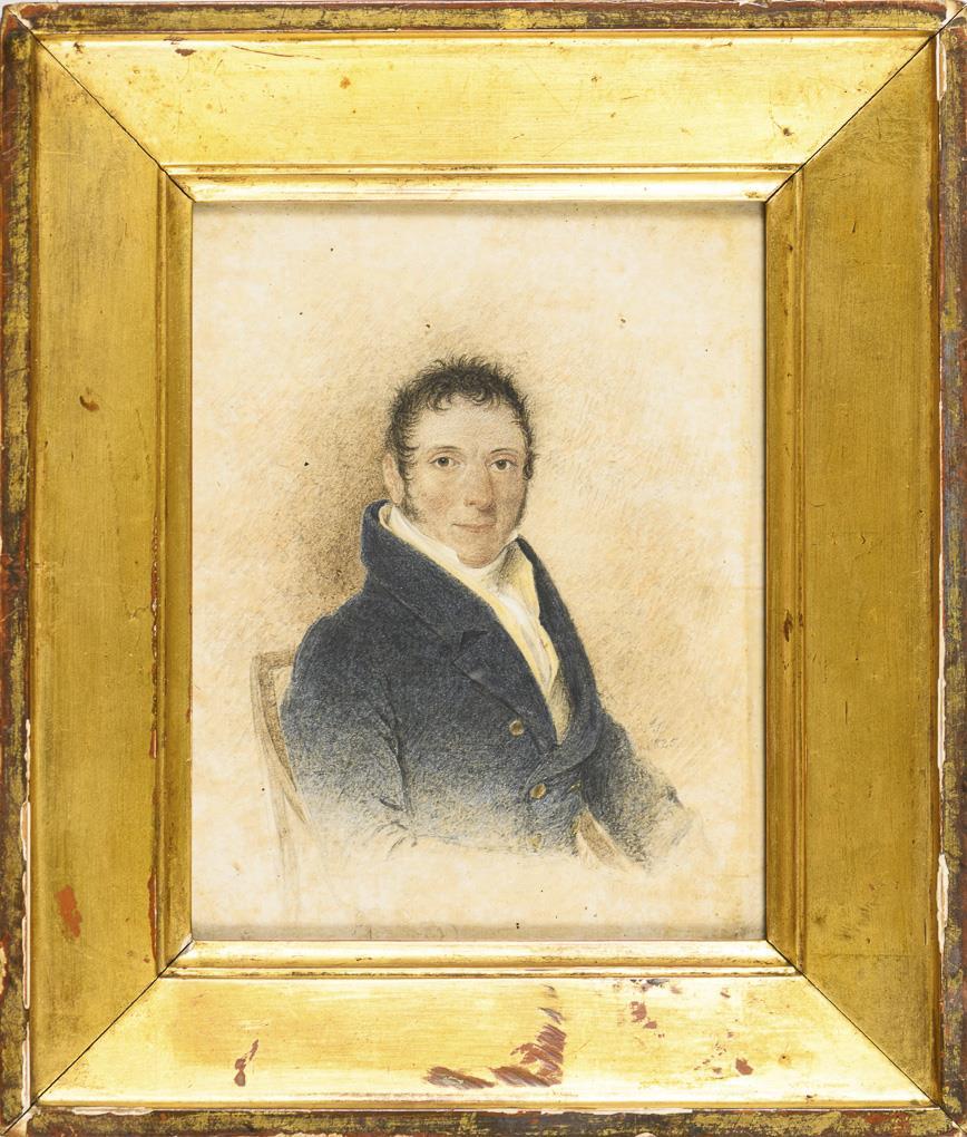 Portrait of a young man in a blue frock coat on a chair. Two small tears in the lower right corner.