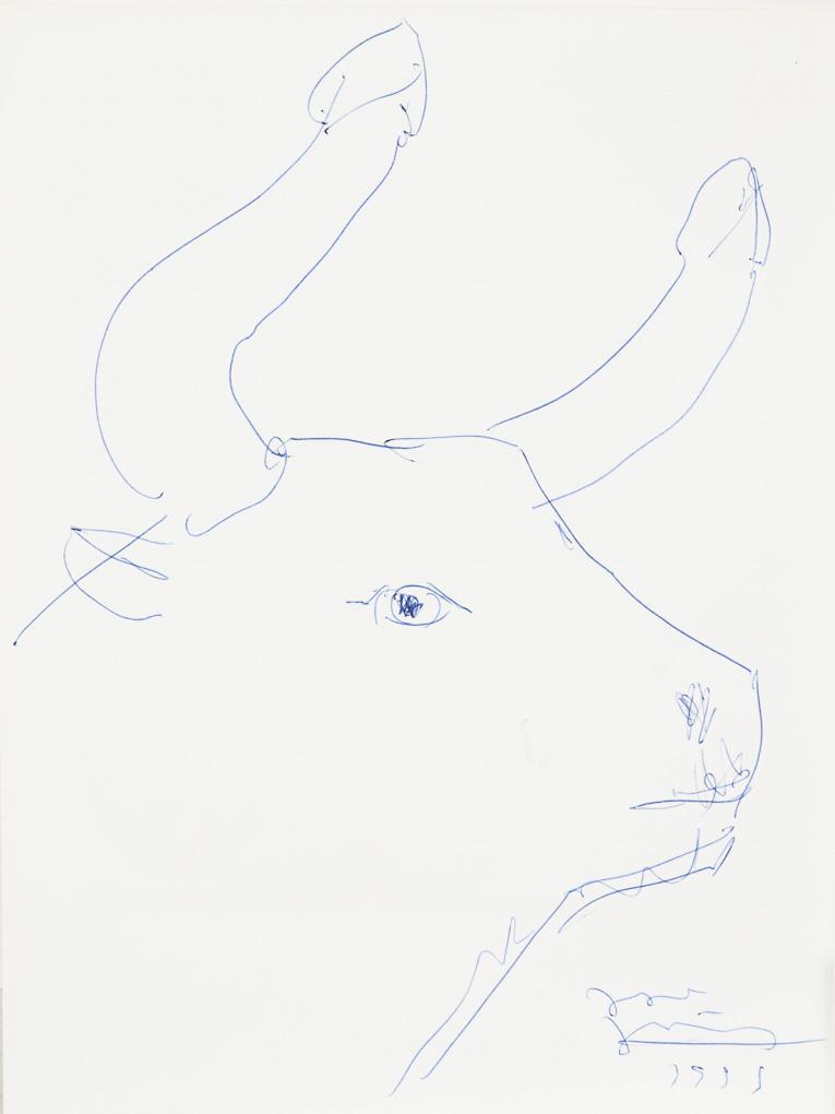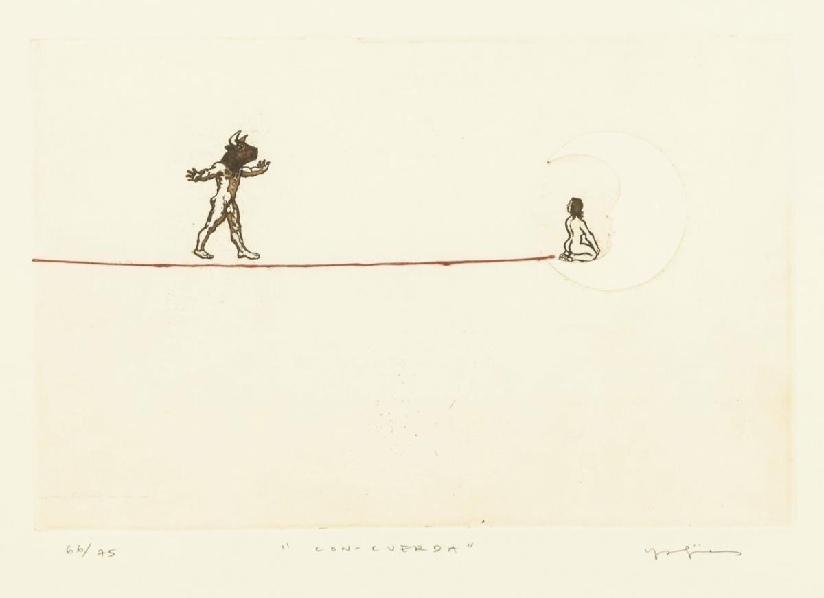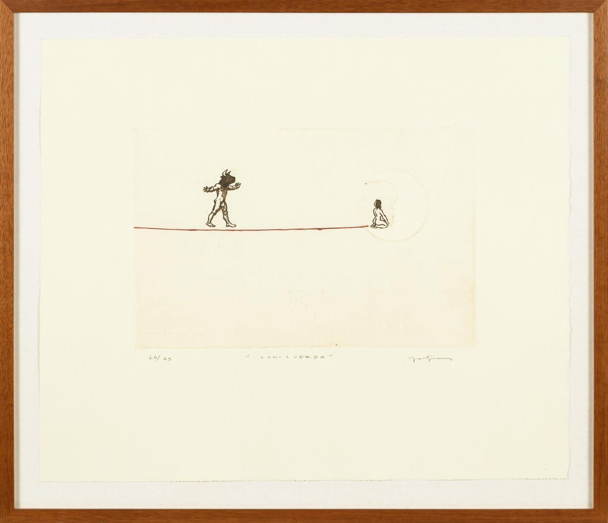 Framed & behind glass Graphic work "Con Cuerda" (Lacing), collaged etching on laid paper, pencil signature, copy: 66/75, printing plate: 22 x 33.5 cm, sheet: 44 x 52.5 cm, framed & behind glass: 52 x 60 cm and unique with outline drawing of the Minotaur on the inside of the protective cover of the portfolio accompanying the exhibition at Galerie Hebecker, Weimar 1999, ballpoint pen drawing, pen signature, dated: 1999, sheet: 28.5 x 21.5 cm, portfolio: 29 x 22 cm.