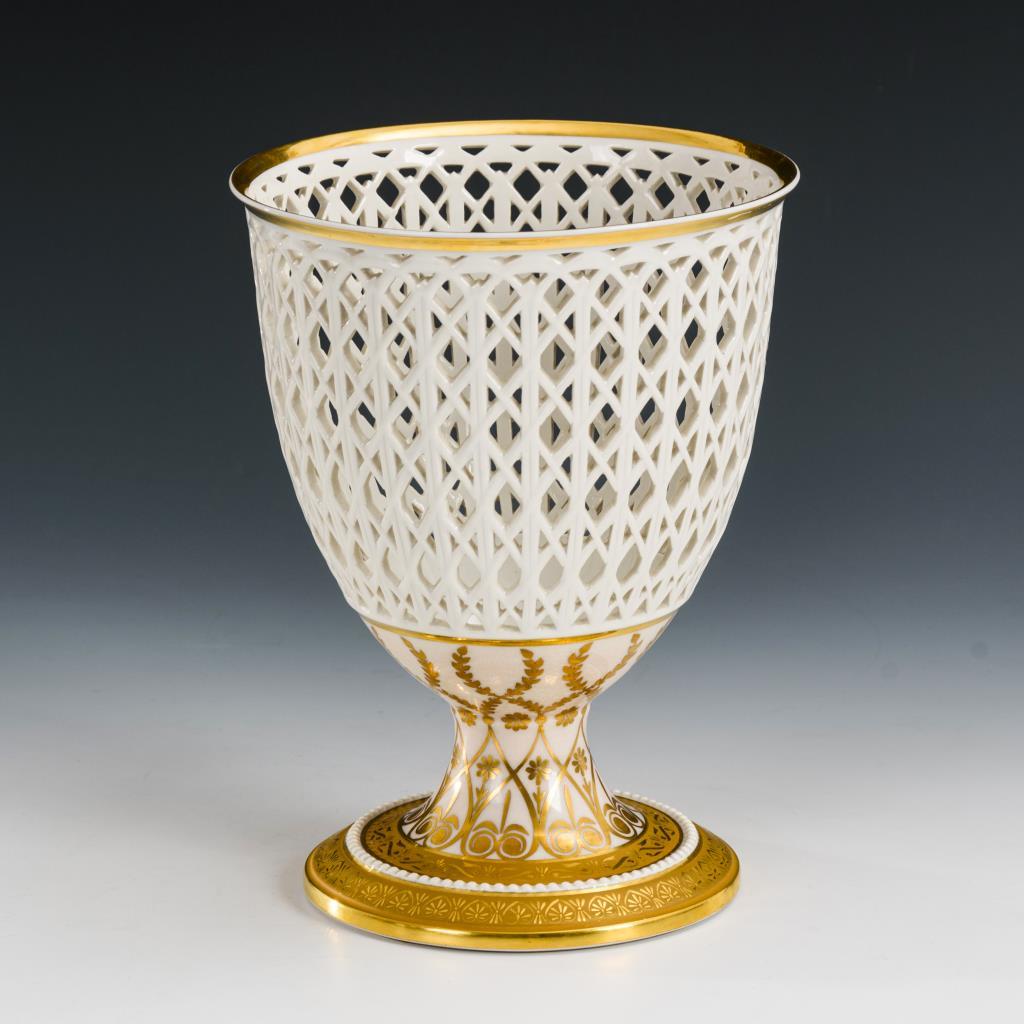 Glockenförmige, gitterartig durchbrochene Kuppa mit kurzem Schaft und Rundfuß. Ohne Einsatz.
