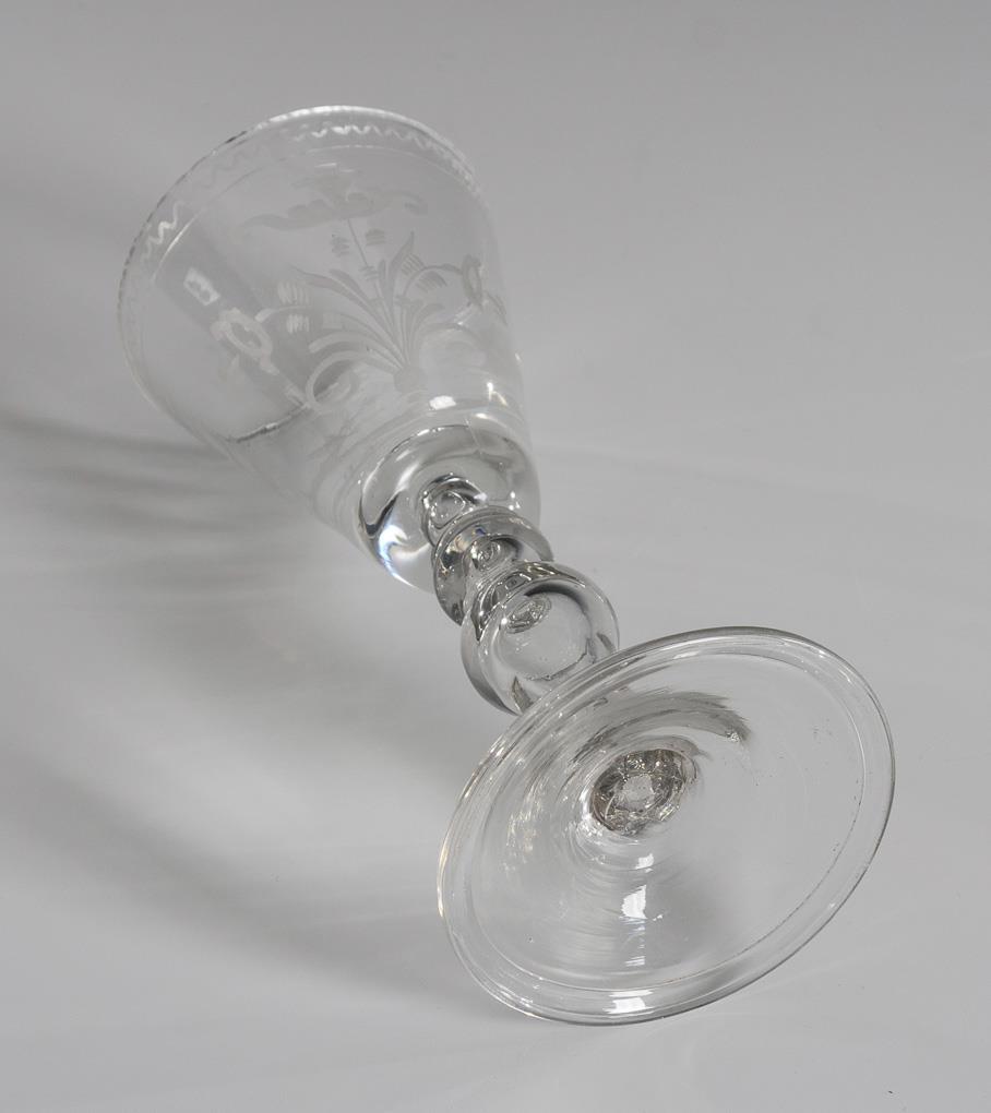 Tapered cup with pierced air bubble in the base of the cup, baluster hollow stem, round base; demolition. On the front the engraved representation of a jumping stag, verso a stylized bouquet of flowers.