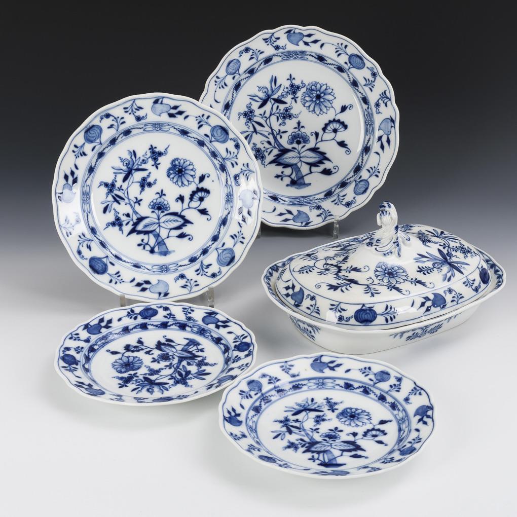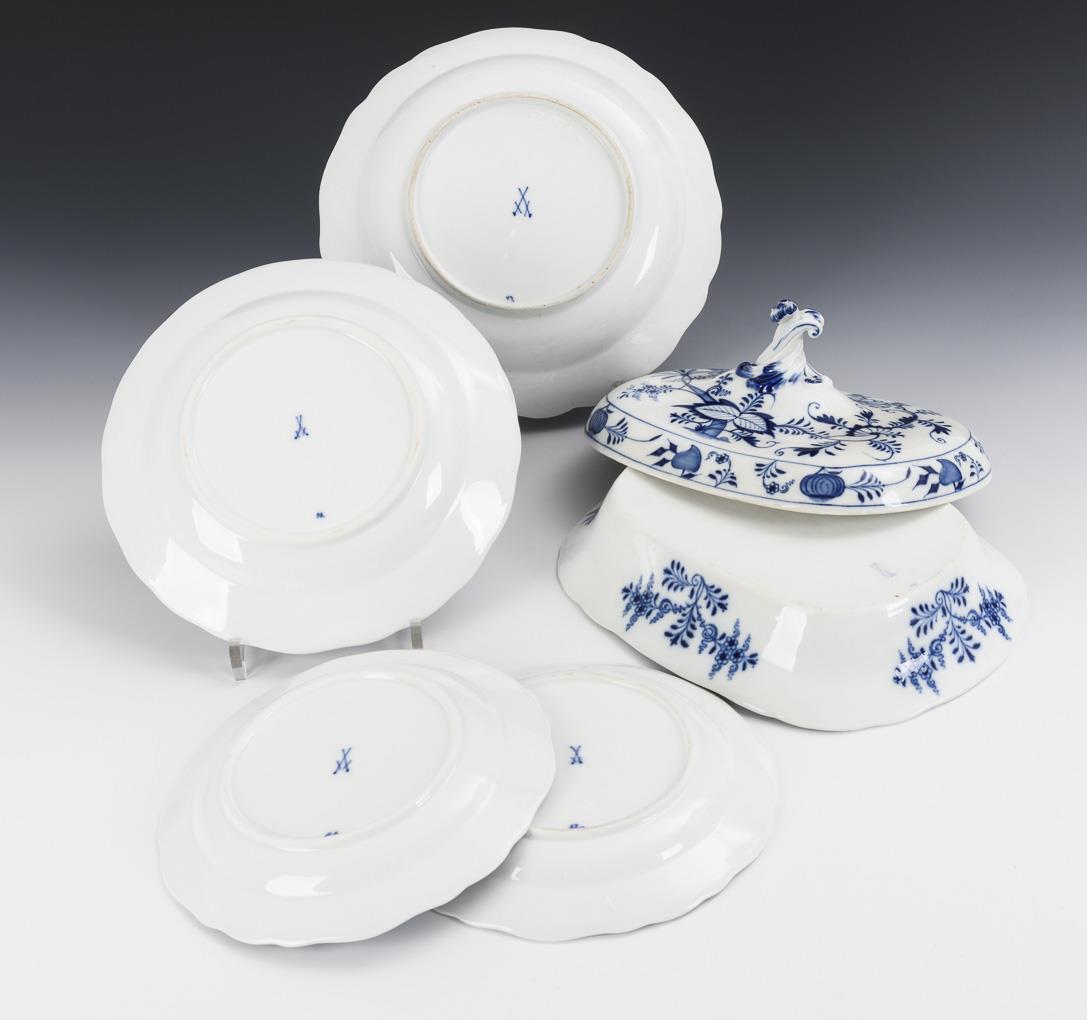 Onion pattern lidded bowl and 4 plates. Meissen.