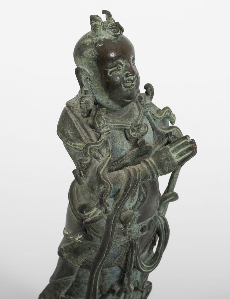 Figure standing on double lotus throne with joined hands. Through ribbons and "blowing" coattails dynamic effect. A curved ribbon on the right arm is missing.