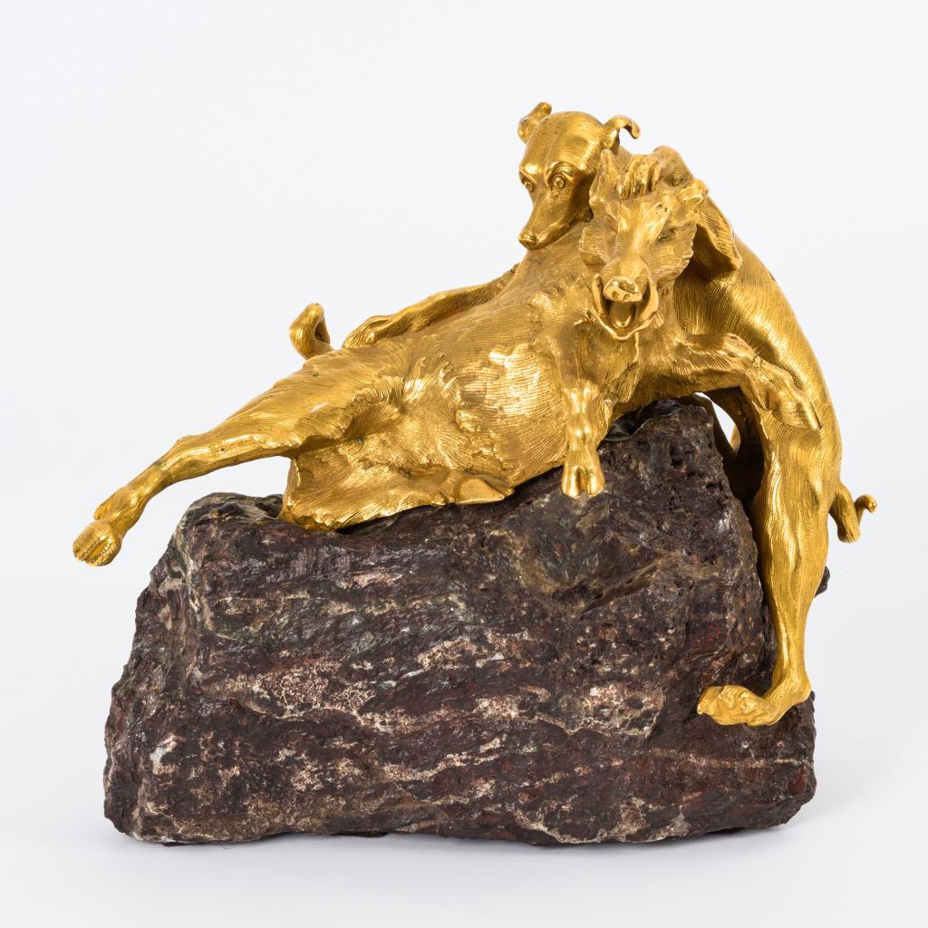 Bronze mit feiner Ziselierung vergoldet, naturalistischer Felssockel aus Bodenseequarz.Wohl um bzw. vor 1800.Gesamt 25 x 28 x 14 cm.