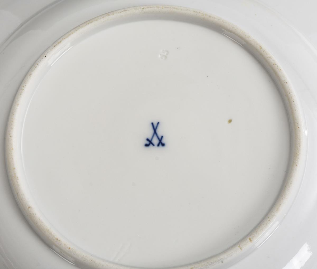 Form "New Cutout". 6 dinner plates, 6 soup plates, 1 fish plate (L 59,5 cm) and 1 lidded bowl (Ø 33,5 cm). 1 soup plate with edge wear, minimal gold rubbing on the edges of the plates.