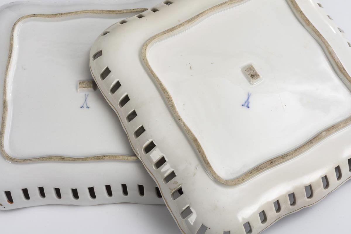 Square bowls with bar pierced flag. In the mirror a bouquet of flowers, the flag with purple and wine-red background. Gold somewhat rubbed, 1x flag restored, 1x short edge hairline crack.